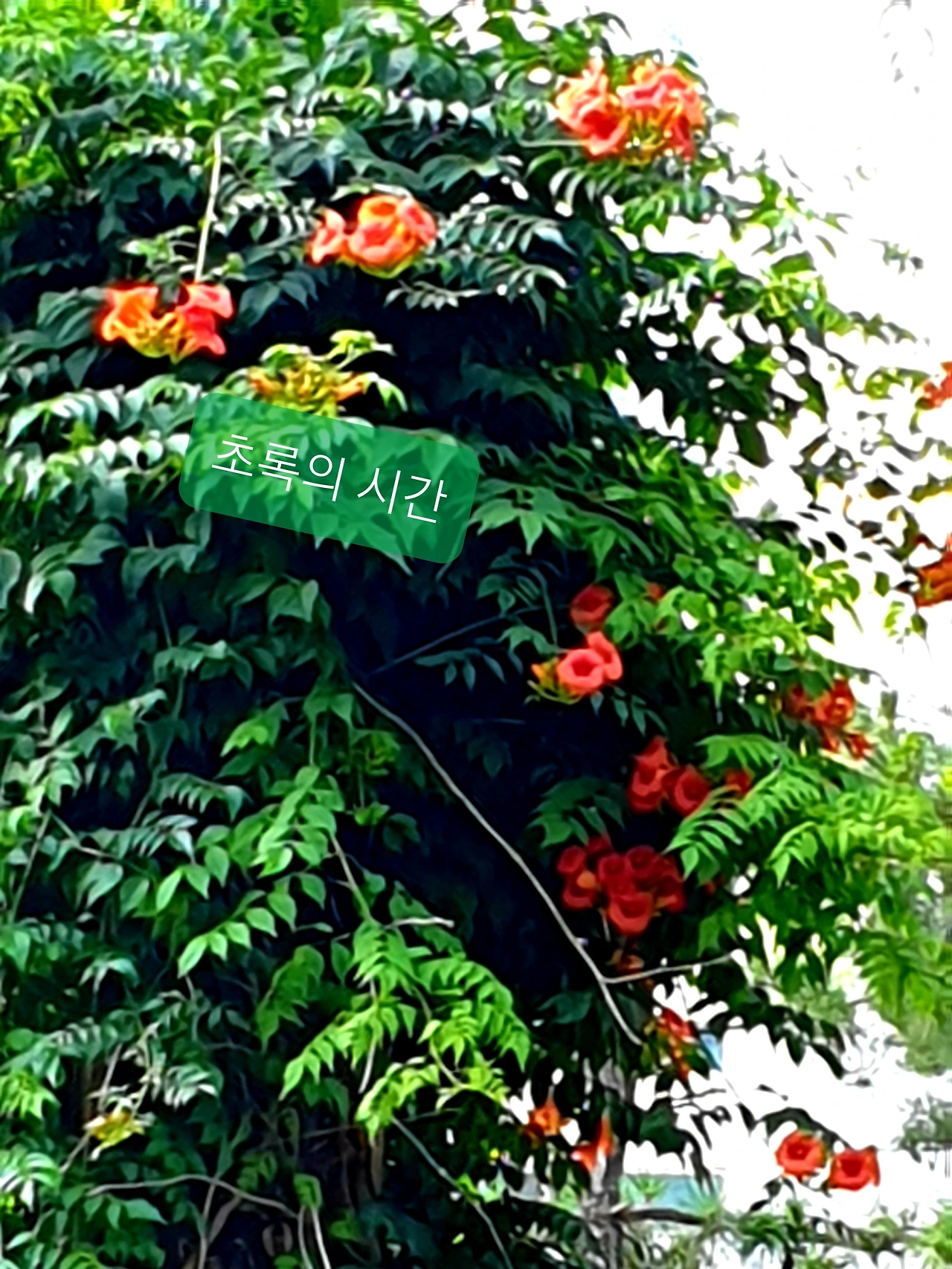 능소화 주홍빛 꽃송이들이 매달려 있으니