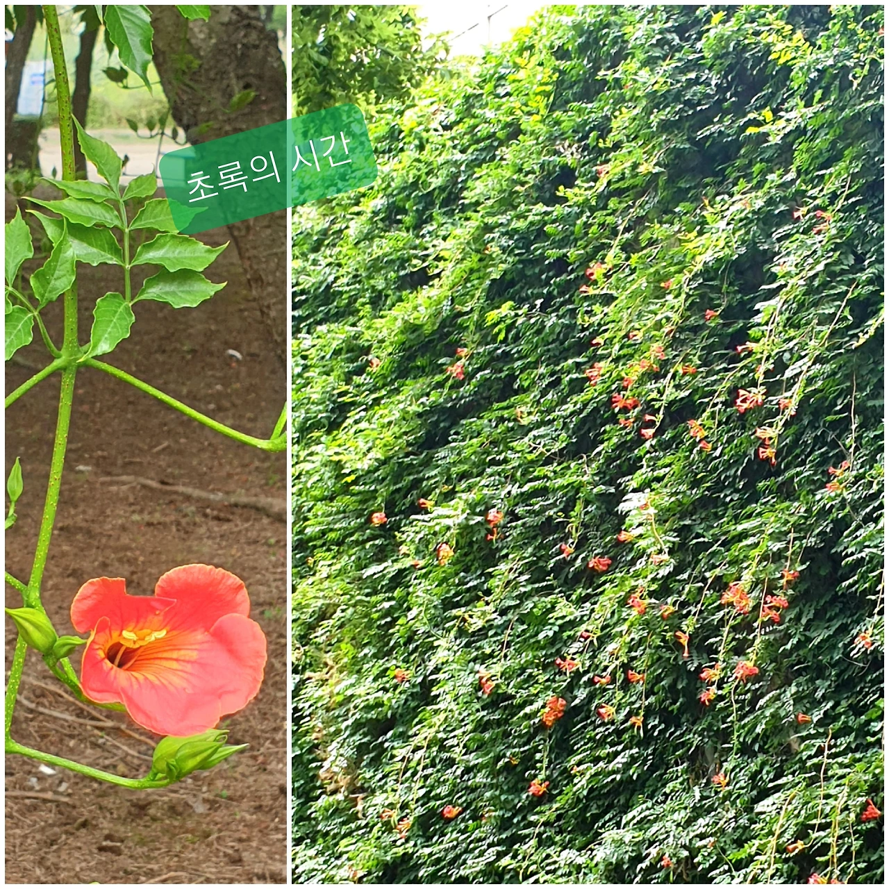 부드럽게 휘늘어진 능소화벽 꽃길이 있어요