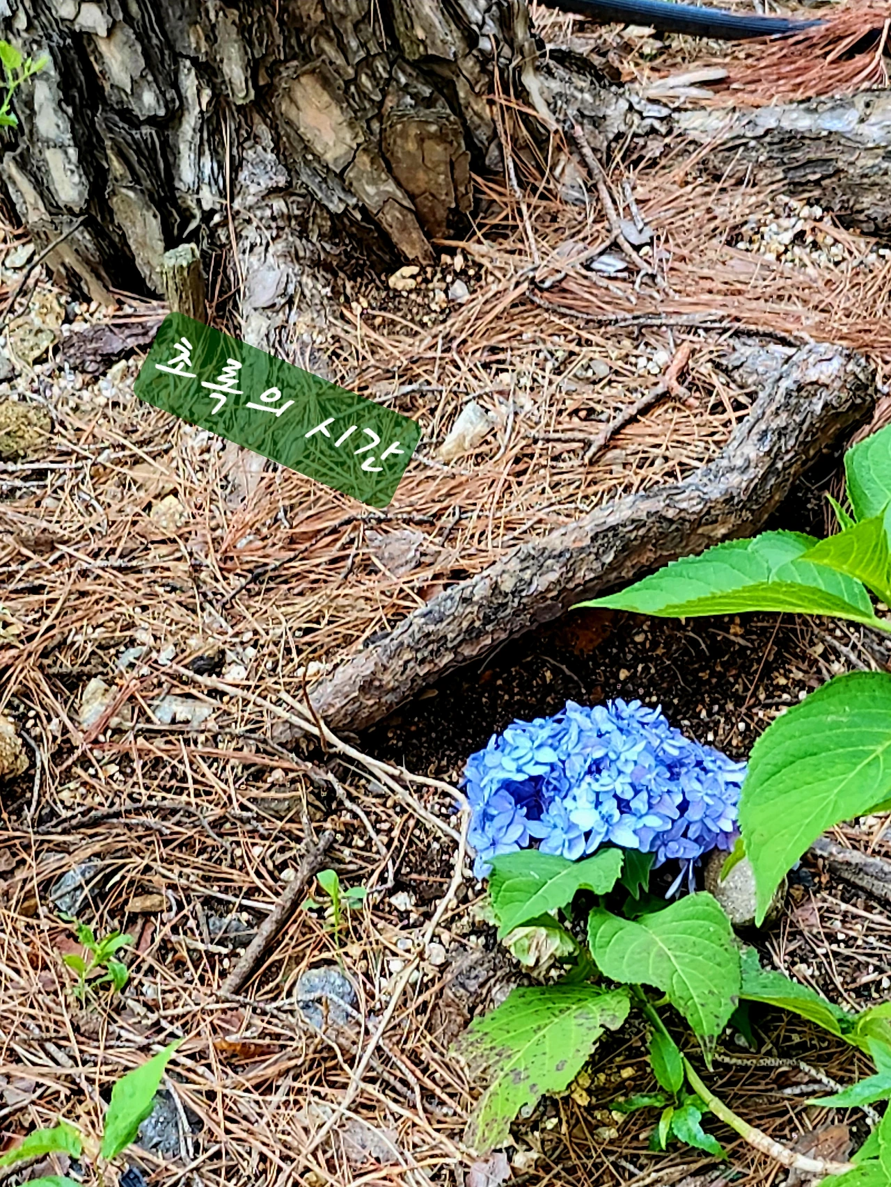 커다란 나무뿌리 옆에 수줍고 쑥스러운 듯