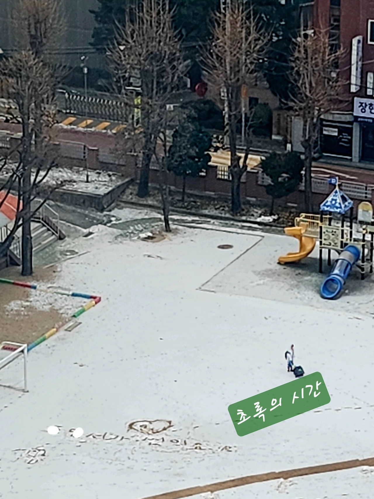 텅 빈 운동장에 하얀 눈이 한가득