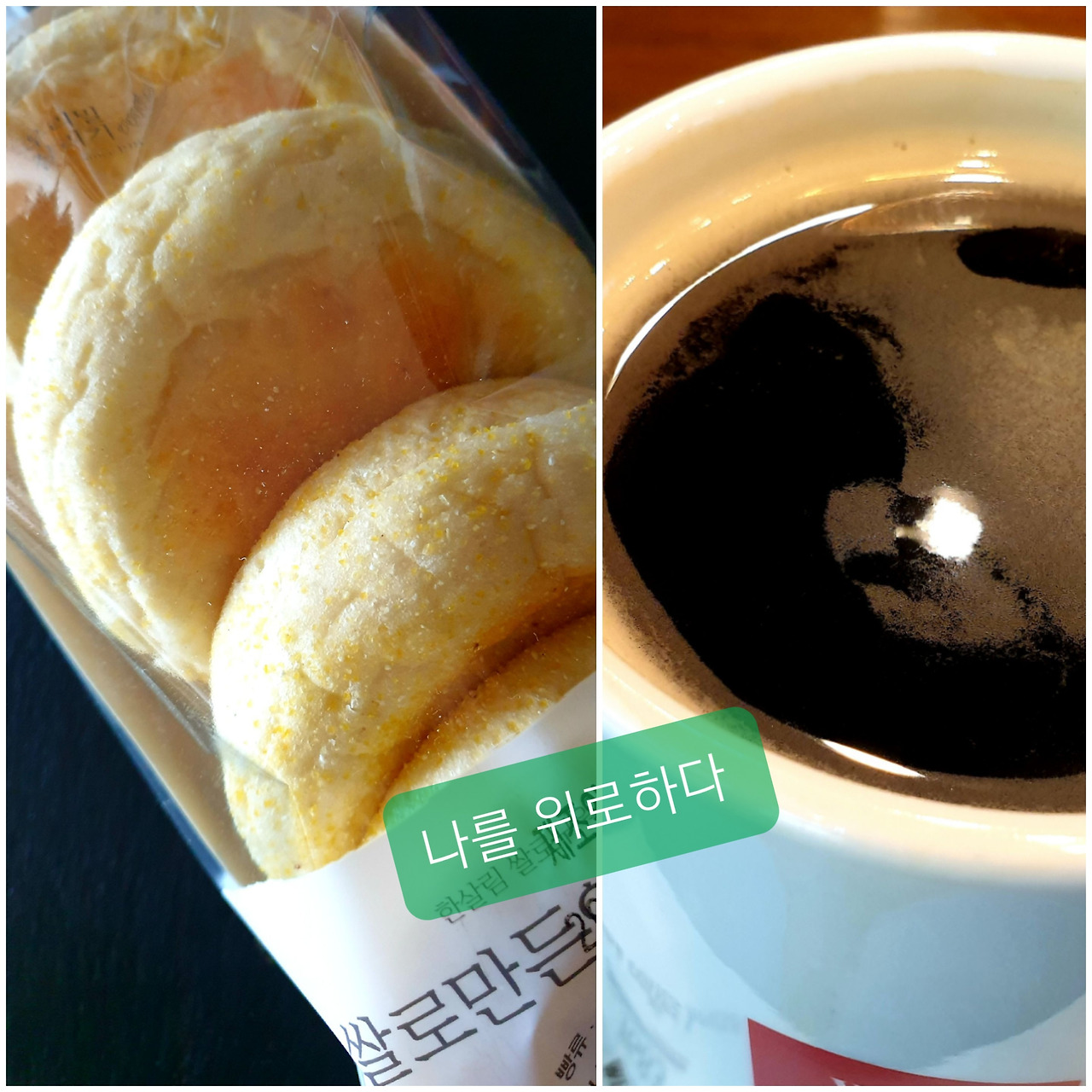 커피 한 잔에 쌀빵 한 조각 앞에 두고