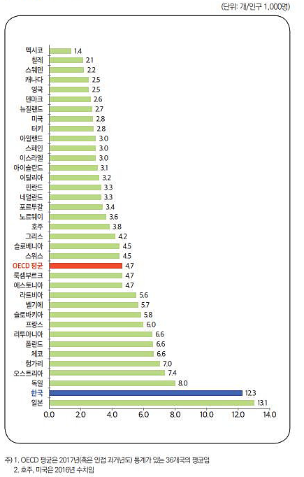 우리나라의 전체 병상 수는 인구 규모에 비교했을 때 세계 최고 수준이다. 보건복지부의 `OECD 보건통계 2019` 에 따르면 2017년 기준으로 한국 병원의 전체 병상 수는 <그림 1>과 같이 인구 천명 당 12.3개로써 일본(13.1개)에 이어 OECD 회원국 중 두 번째로 많다. OECD 회원국들의 인구 천명 당 평균 병상 수(4.7개)의 2.6배나 많다.