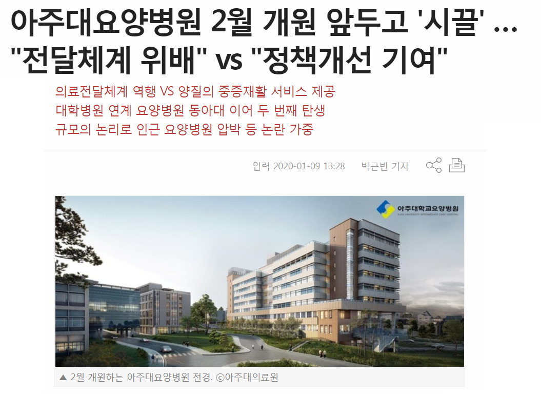 이런 관점에서 아주대 요양병원의 개원과 이를 둘러싼 갈등은 우리나라 보건의료산업 발전의 성장통이라 할 수 있다. 다양성이 시도되는 전초전 또는 새로운 파괴의 시작으로 보아야 한다.