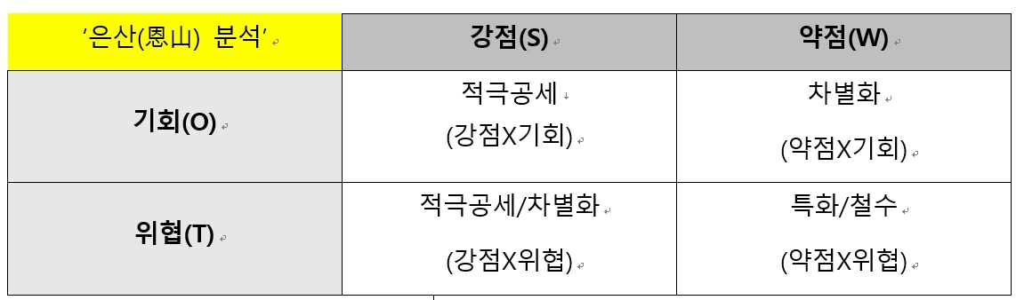 이상과 같이 단순한 SWOT 분석과 TOWS 전략 수립이 아니라 SWOT 분석 후 ‘은산(恩山) 분석’을 한번 더 거친 후 TOWS 분석을 적용한다면 상대방도 예측하지 못하고 내부적인 장점도 극대화할 수 있는 새로운 전략을 만들 수 있다.
