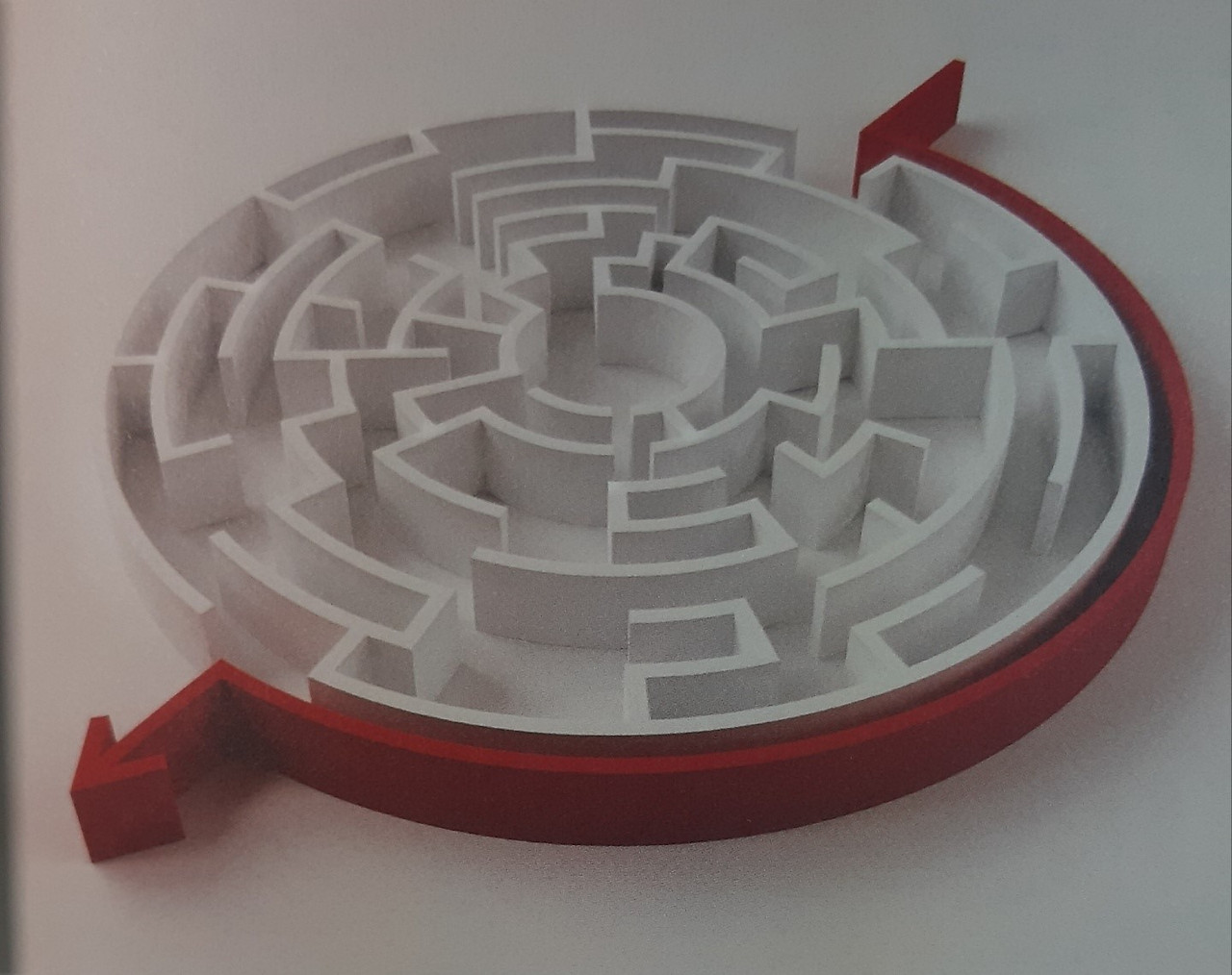 고정관념에 빠지게 되면, 옆의 그림처럼 주어진 명제가 ‘미로 찾기’라고 했을 때, 우리의 선택은 시작 소리와 함께 얼마나 빨리 미로 속으로 뛰어들어가느냐는 선택 밖에 못하게 된다. 빨리 들어가 봐야 오랜 시간에 걸쳐 겨우 출구를 찾거나, 도중에 막혀 포기하는 수 말고는 없는데도 앞 뒤 옆을 안보고 미로 안으로 들어가려고만 한다.