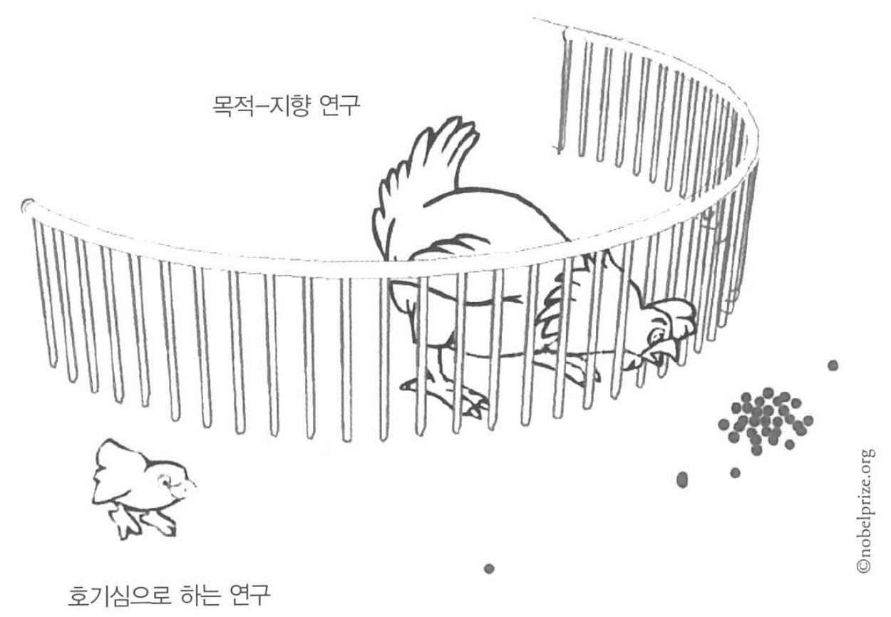 핸슈는 어른 닭이 눈에 보이는 먹이 만을 추구하는 것을 목적-지향 연구라 하였다. 목적-지향 연구를 하다 보니 먹이에 한눈이 팔려 울타리 뒤가 뚫려 있는 것을 보지 못하고 먹이도 못 먹더라는 것이다. 그런데 병아리는 어미닭의 보호구역에서 벗어나 여기저기 돌아다니다가 뒤쪽에 열려있는 울타리를 통해 밖으로 돌아 쉽게 먹이에 접근할 수 있음을 보여주고 있다. 핸슈는 이것을 호기심으로 하는 연구라고 명명하였다. 그리고 핸슈는 이 그림을 통하여 자기가 노벨 물리학상을 받은 것도 어미닭과 같은 자세가 아니라 병아리 같은 유연한 생각으로 우연치 않은 시도를 통해서 알아낸 연구성과 때문에 노벨상을 받은 것이라는 설명을 하였다.