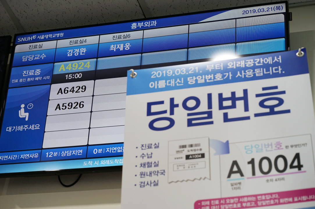 이와 같은 병원 환경에서 최근 환자 대기 공간에 환자 이름 대신 고유번호, 소위 당일 번호로 환자를 부르는 병원이 탄생하였다. 서울대병원은 2019년 3월 말부터 국내 최초로 환자 이름을 호명하지 않는 진료 서비스를 시작하였다. 환자는 진료 당일 본인의 이름 대신 고유번호를 부여받아 하루 동안 사용하게 된다. 진료 접수를 하면 당일 사용할 'A0000'같은 번호를 받고 이것이 전체 외래에서 당일 사용하는 본인 이름 대신 사용하는 호출 및 식별기호가 되는 것이다. 이름이 완전히 사라진 것이다. 예컨대 "홍길동 님, 들어오세요"가 아닌 "A0000 님, 들어오세요"로 환자를 식별하고 호명하는 방식이다. 당일 첫 진료 때 부여받은 개인의 고유번호는 같은 날 채혈실, 각종 검사실, 약국, 마지막 수납까지 모든 외래 공간에서 동일하게 사용된다. 이와 같은 변화에 따라 개인 정보보호를 바라는 개인에게는 만족도가 높을 수 있으나 장년층이나 노인들의 경우 본인의 고유번호를 잘 인식하지 못하거나 오히려 불편을 느낄 수도 있을 것이기 때문에 변화된 시스템이 완전히 정착되기 위해서는 한동안의 시간이 필요할 것으로 예상된다.