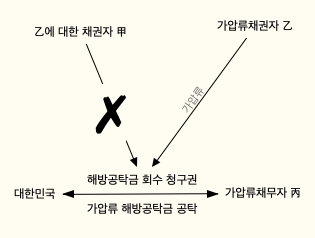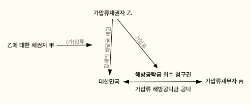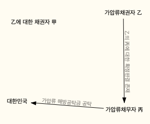 기본적인 상황은 왼쪽 그림과 같다. 乙이 丙의 재산에 가압류를 하니, 乙이 가압류 해방공탁금을 공탁하였다. 그 후 乙과 丙의 소송이 진행되던 중 乙에 대한 채권자 甲이 등장해, 乙이 丙에게 승소하였을 때 받아갈 공탁금에 대해 압류 및 추심하였다고 가정하자.[*] 그리고 乙과 丙의 소송은 乙의 승소로 확정되어 종료 또는 가집행부 승소 판결이 있었다.