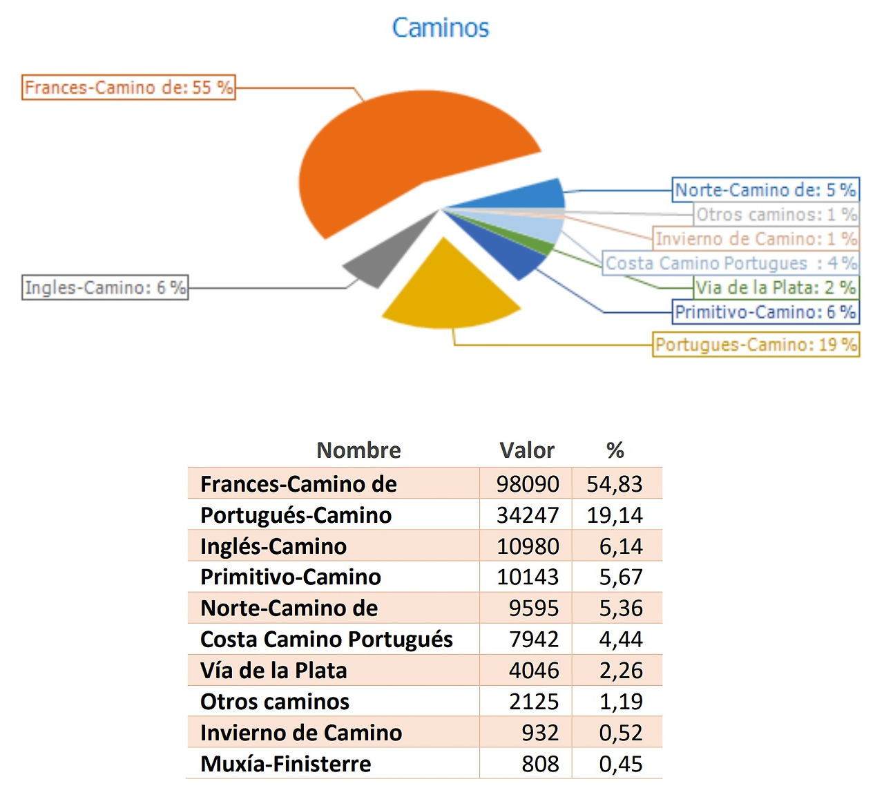 그중 역사가 깊고 가장 많은 순례자들이 택하는 길은 프랑스 길로, 순례자 공식 통계에 따르면 2021년 순례자 중 절반이 넘는 55%가 프랑스 길을 걸었고, 20%가 포르투갈 길을 걸었다. 많은 순례자들이 걷는 길은 그만큼 편의 시설이 많고, 길 위 이정표도 잘 정비되어 있다는 뜻으로 처음 순례길을 걷는다면 프랑스 길을 선택하는 것이 여러 가지로 부담이 덜하다.
