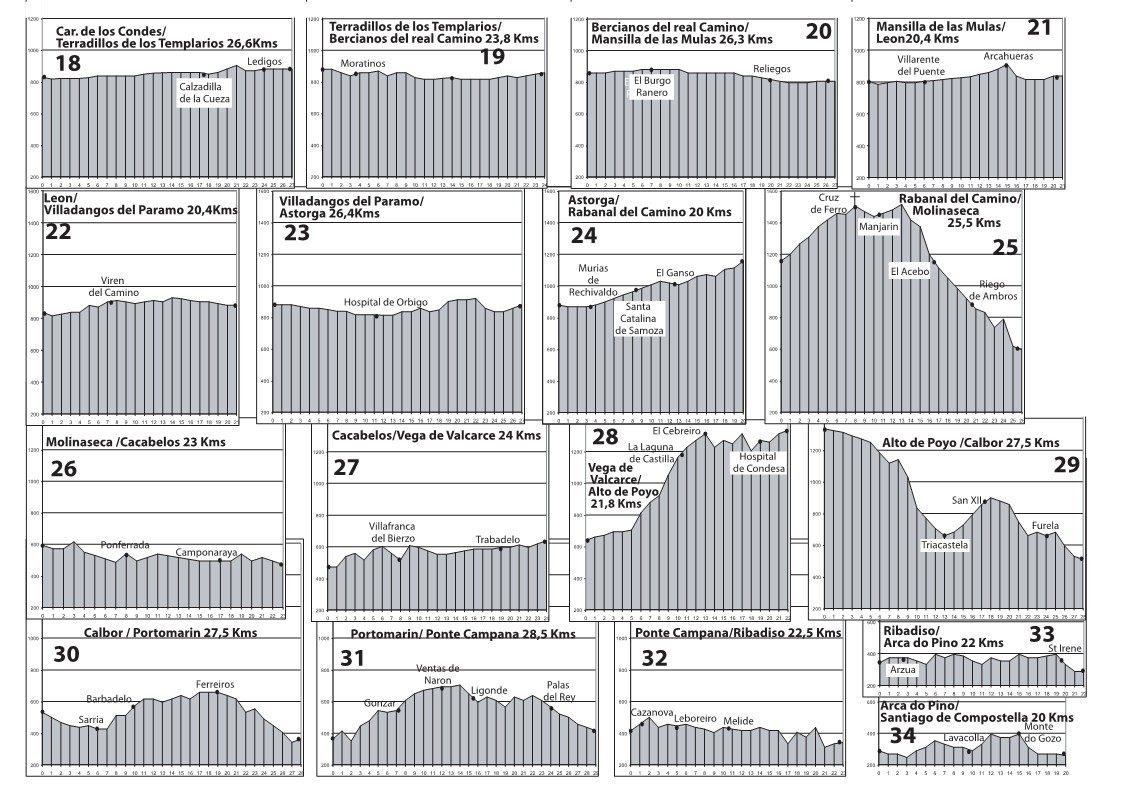 생장 순례자 사무실에서 배포하는 프랑스 길 프로필에는 34개로 나눈 구간의 고도와 거리가 적혀 있다. 생장에서부터 프랑스 길을 시작한다면 표와 같이 34일 일정이 큰 무리 없이 걷기에 좋지만, 체력에 따라 40일 50일 60일을 걸어도 괜찮다. 다른 이들이 20~30Km를 걷는다고 나도 그렇게 걸어야 하는 것은 아니다. 하루 10Km씩 천천히 걸어도 된다. 이 길은 빨리 또 많이 걷기 레이스가 펼쳐지는 시합이 아니라 순례라는 영적인 길이기 때문이다.