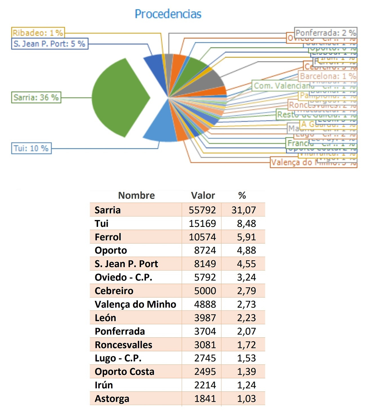 아래는 순례를 시작한 장소에 관한 통계다. 위의 자료에서 프랑스 길을 걸은 순례자는 55%였으나, 프랑스 길의 시작인 생장에서의 출발은 5%이고 사리아(Sarria) 출발이 36%다. 사리아는 산티아고 데 콤포스텔라에서 100Km 떨어진 곳으로, 순례증서인 콤포스텔라(Compostela)를 받기 위한 최소한의 거리(도보 순례인 경우 마지막 100km, 자전거는 200km)가 된다. 건강의 이유로 장거리 도보가 어렵거나 혹은 생업이나 학업의 이유로 오랜 기간 체류가 어려운 경우 사리아에서 순례길을 시작하면 3~4일 걷기로 순례를 마치고, 출국과 귀국 비행시간을 합쳐 일주일이면 가능한 일정이 되므로 각자가 처한 상황에 맞춰 경로와 일정을 계획하면 된다.