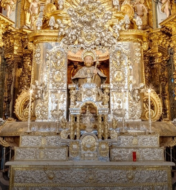 영광의 문을 지나 정면 중앙 제대 위로 야고보 사도의 반신상이 있는데 순례자들은 제대 옆 계단으로 올라가 야고보상에 손을 얹거나 껴안고 기도를 한다. 제대 아래 지하에는 야고보 성인의 유해가 있어 참배한다.