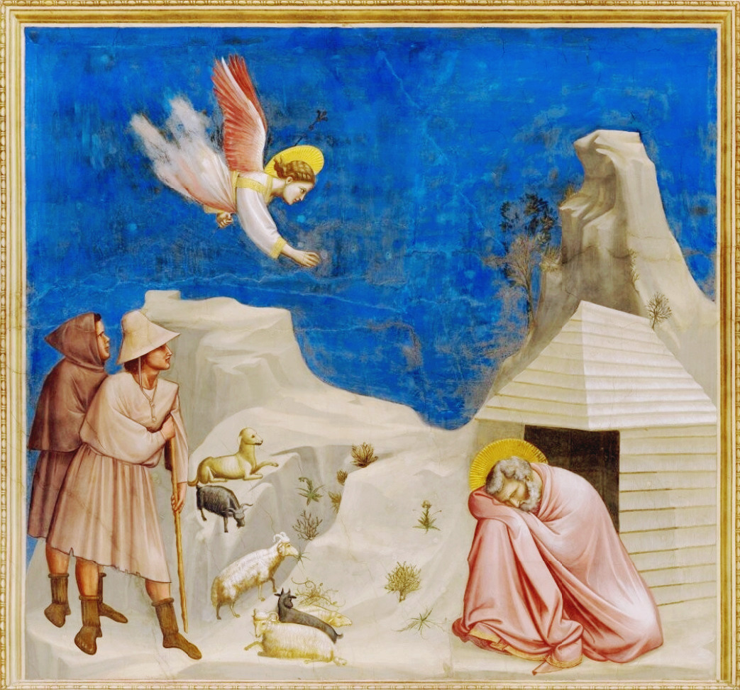 이 그림은 요아킴의 제사가 중심이지만 가장 먼저 나의 눈길을 끈 것은 양들이 뜯는 풀꽃이었다. 조토 회화의 큰 특징은 인물들의 강인하고 굵은 선인데 광야에서 꽃을 피운 풀들의 여리고 섬세한 표현이 마치 나풀거리는 손수건의 고운 자수와 같아서 눈을 뗄 수 없었다.