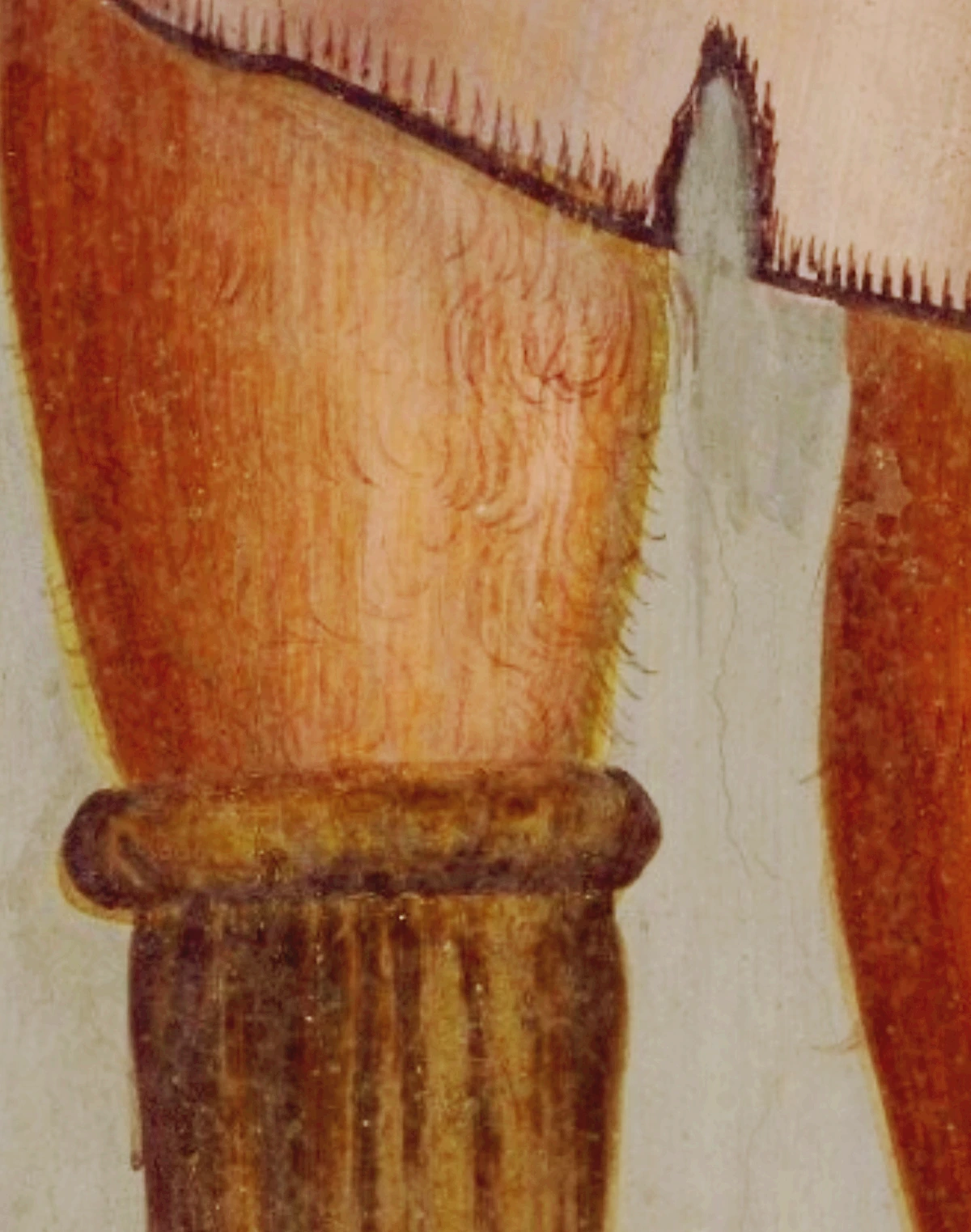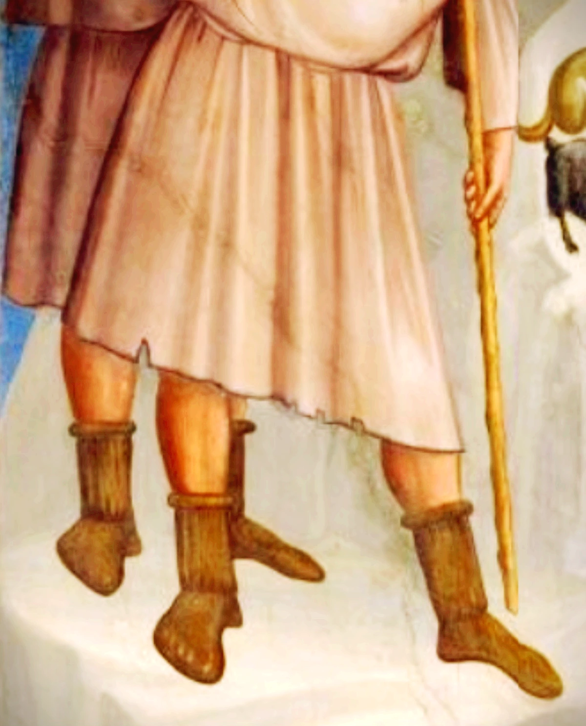 요아킴의 뒤로 바구니를 들고 있는 이의 목에 묶은 끈 매듭이 정교하게 표현되어 있는데 도성을 벗어난 적이 없는 평탄한 삶인지 매끈한 종아리가 목동들과 비교된다.