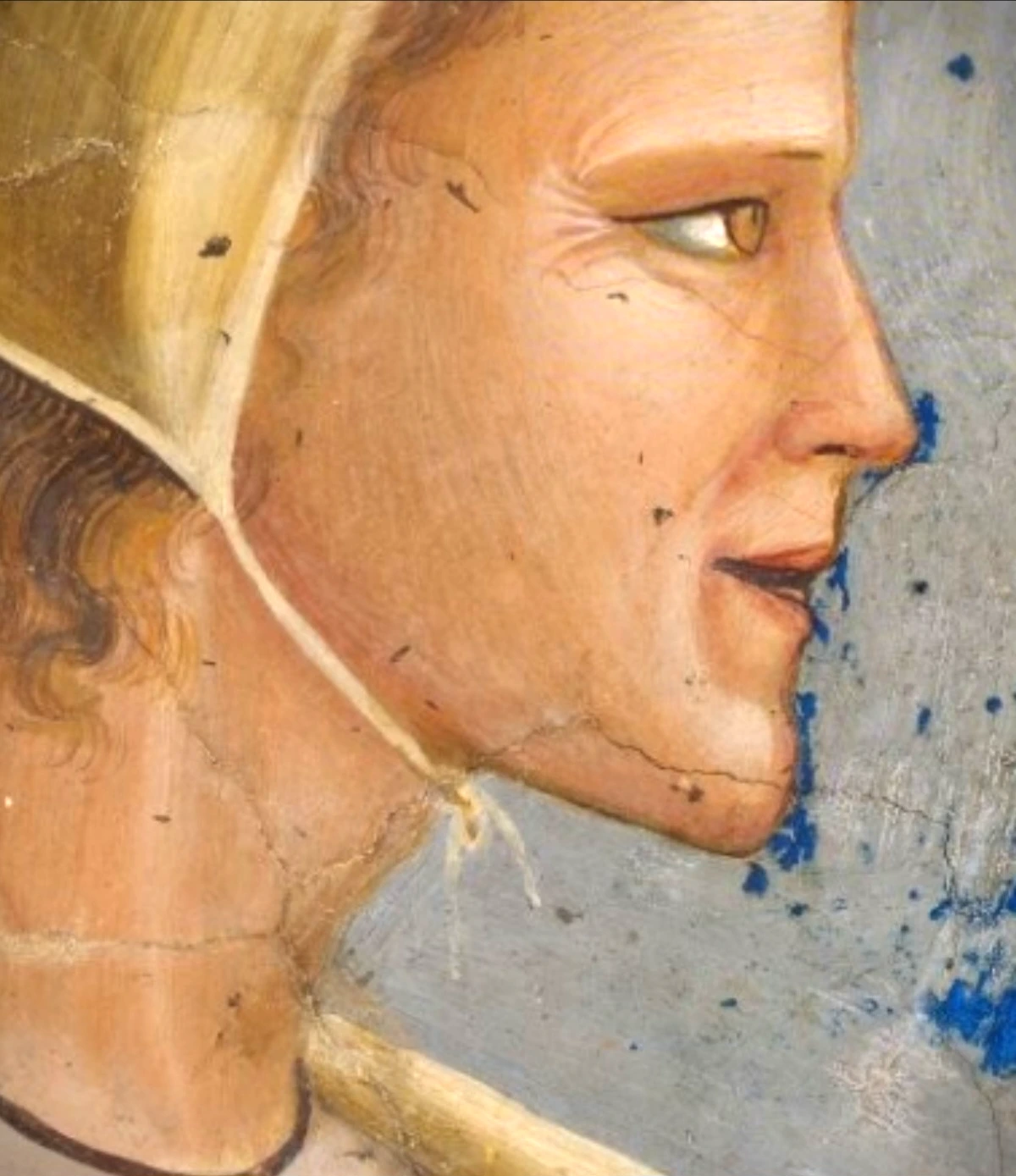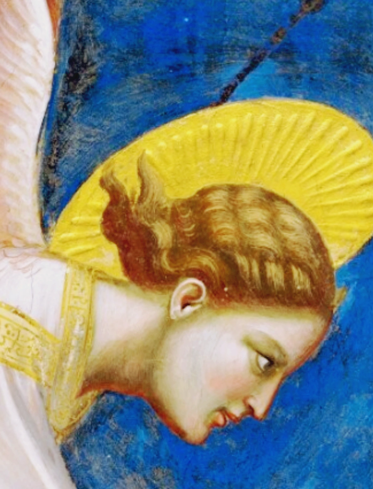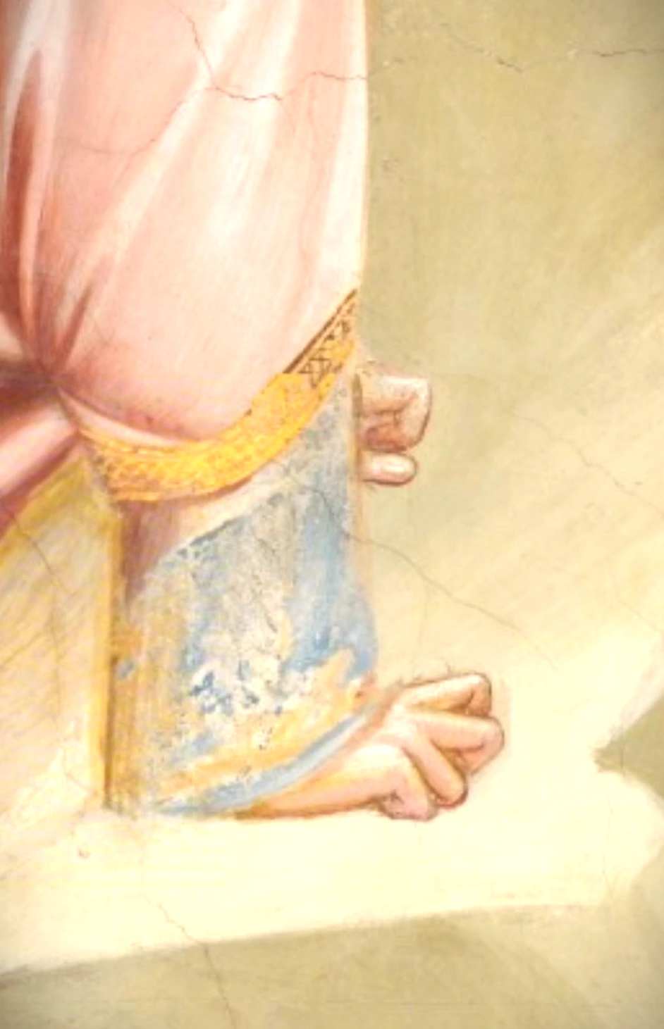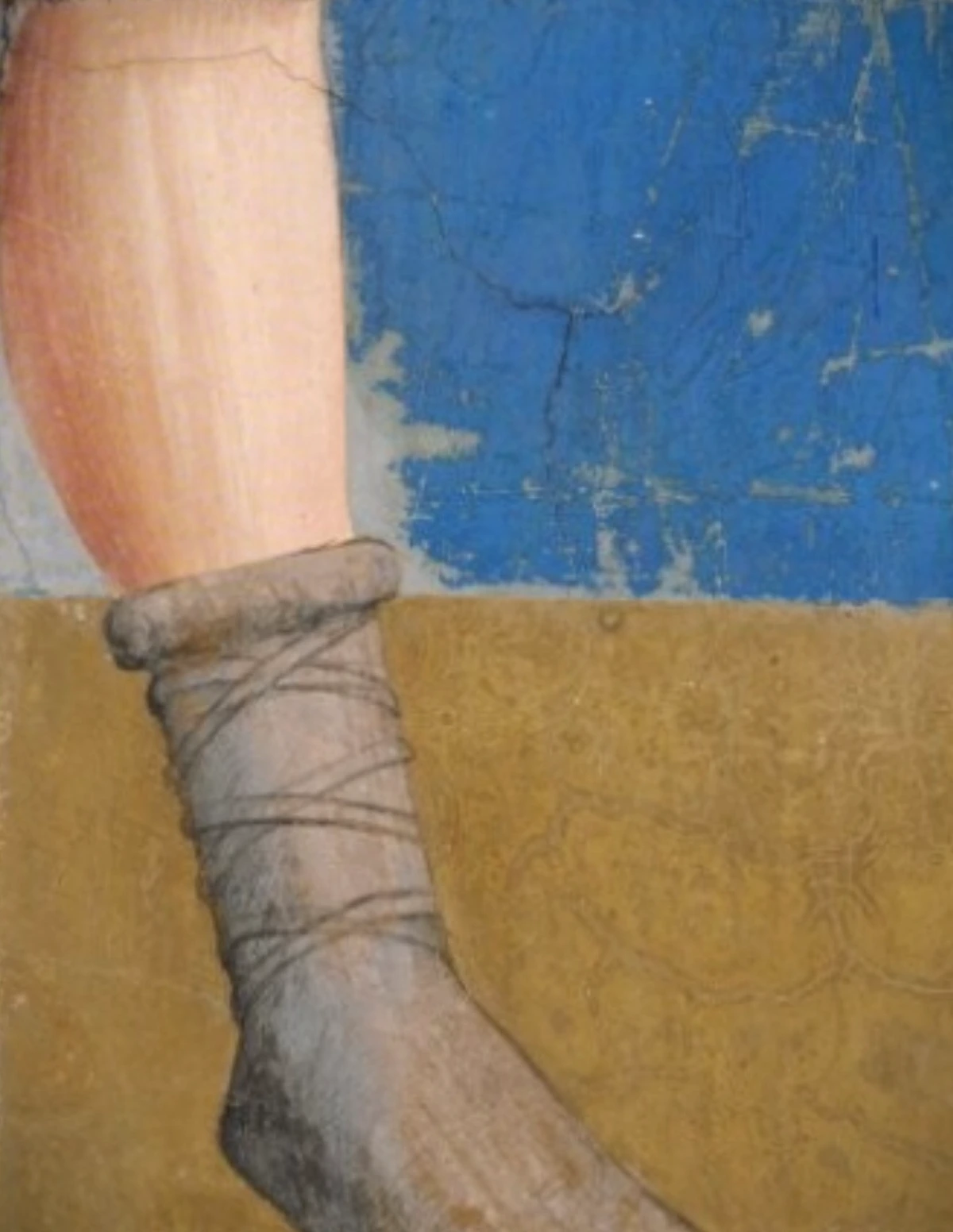 바람에 날리는 천사의 머리칼이 하늘에서 내려오는 속도감을 나타낸다. 요아킴은 온몸이 망토로 뒤덮여 보이지 않지만 잔뜩 웅크린 그의 자세가 온전히 드러나 있다. 이러한 표현은 앞에서 소개한 그림 <3. L'annuncio di Anna 안나의 발표>에서도 볼 수 있는데 가락바퀴를 손에 들고 실을 잣고 있는 젊은 시종의 앉은 자세가 바로 그렇다. 치마로 가려졌지만 무릎의 높이를 다르게 하고 삐딱하게 앉아있는 다리의 윤곽이 선명했었다.