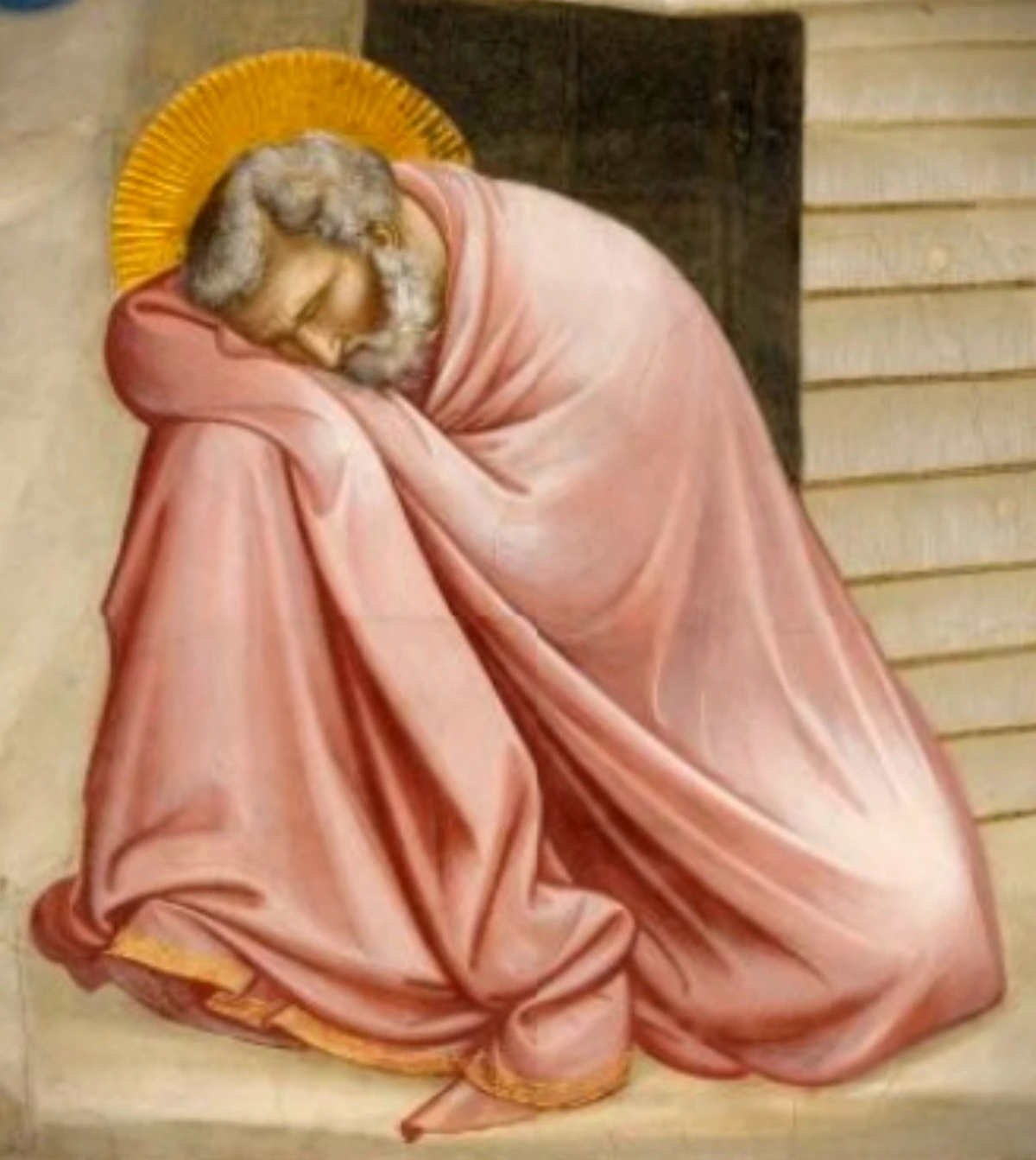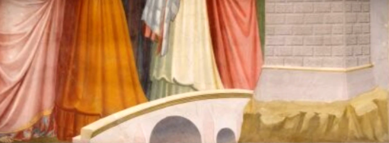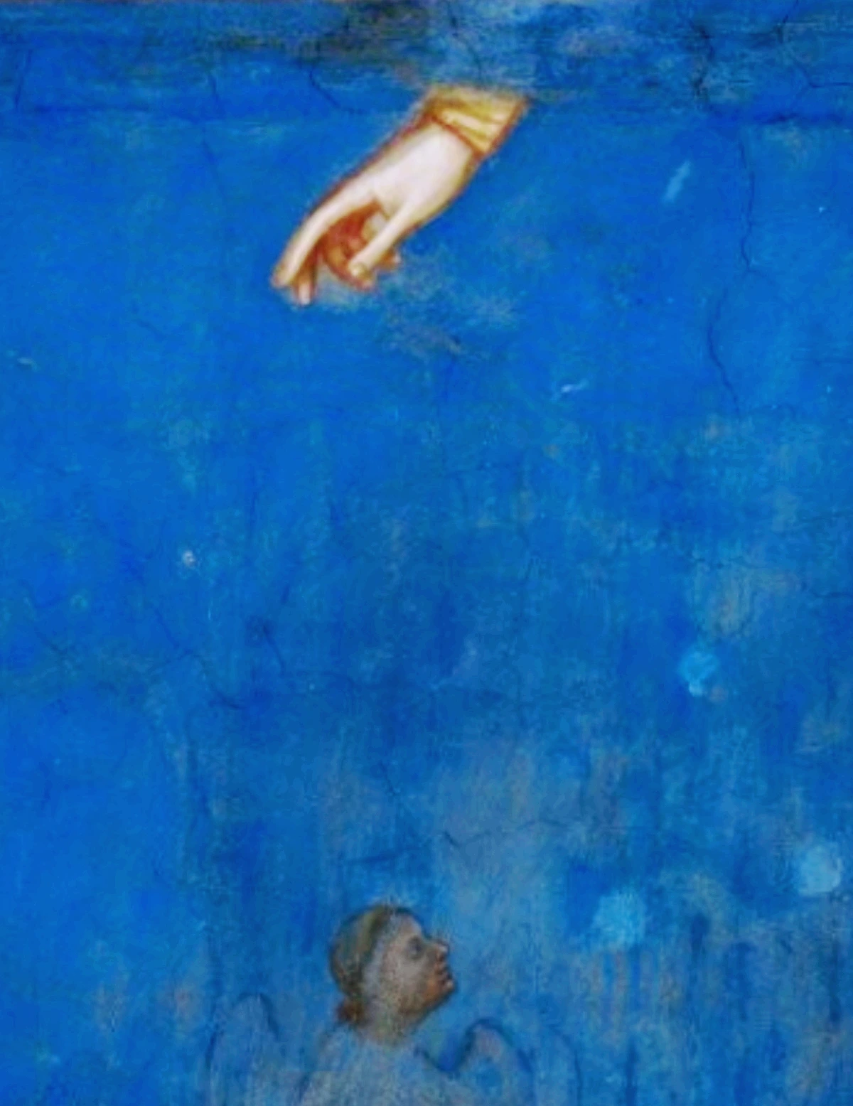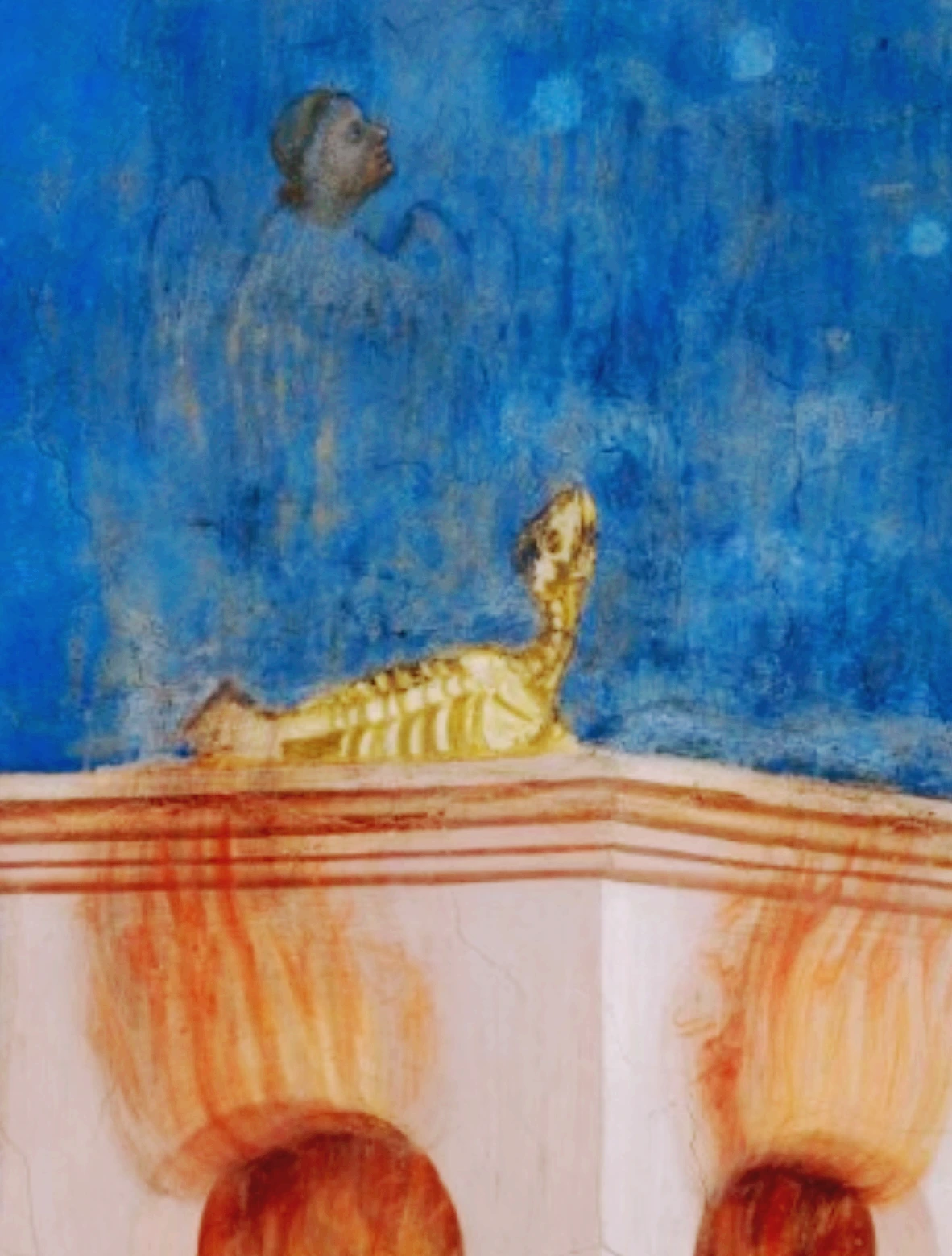 바람에 날리는 천사의 머리칼이 하늘에서 내려오는 속도감을 나타낸다. 요아킴은 온몸이 망토로 뒤덮여 보이지 않지만 잔뜩 웅크린 그의 자세가 온전히 드러나 있다. 이러한 표현은 앞에서 소개한 그림 <3. L'annuncio di Anna 안나의 발표>에서도 볼 수 있는데 가락바퀴를 손에 들고 실을 잣고 있는 젊은 시종의 앉은 자세가 바로 그렇다. 치마로 가려졌지만 무릎의 높이를 다르게 하고 삐딱하게 앉아있는 다리의 윤곽이 선명했었다.