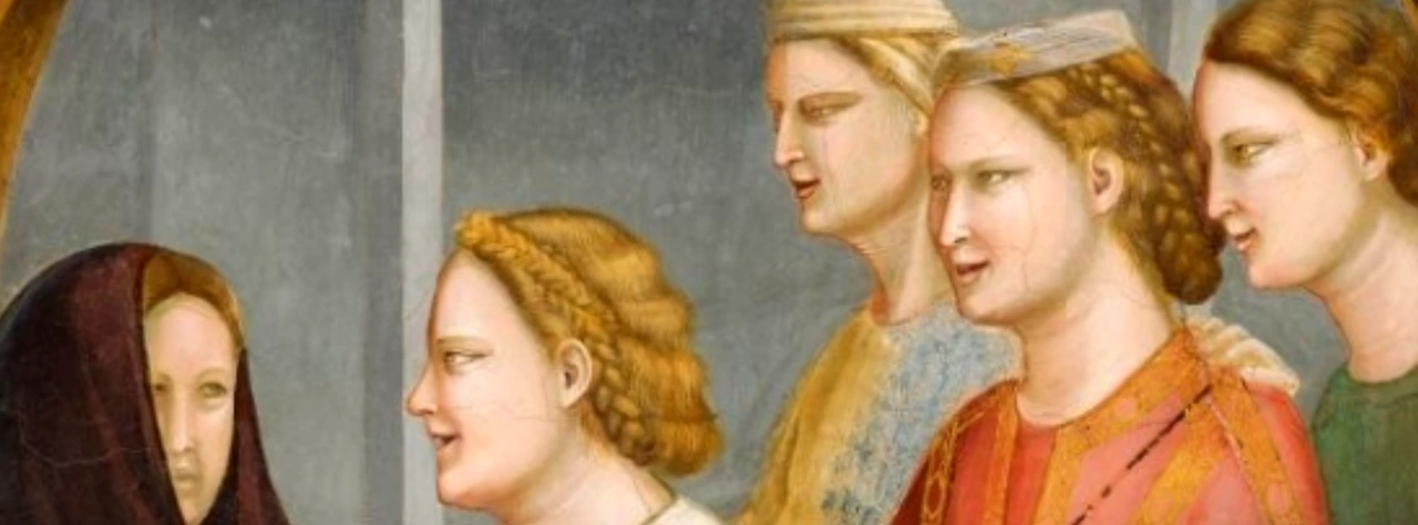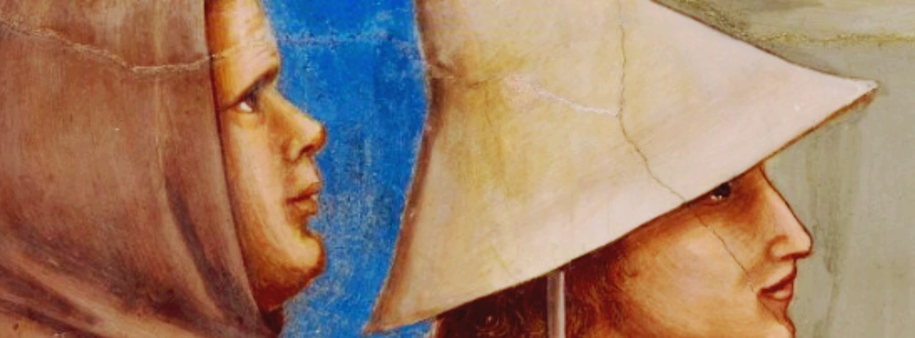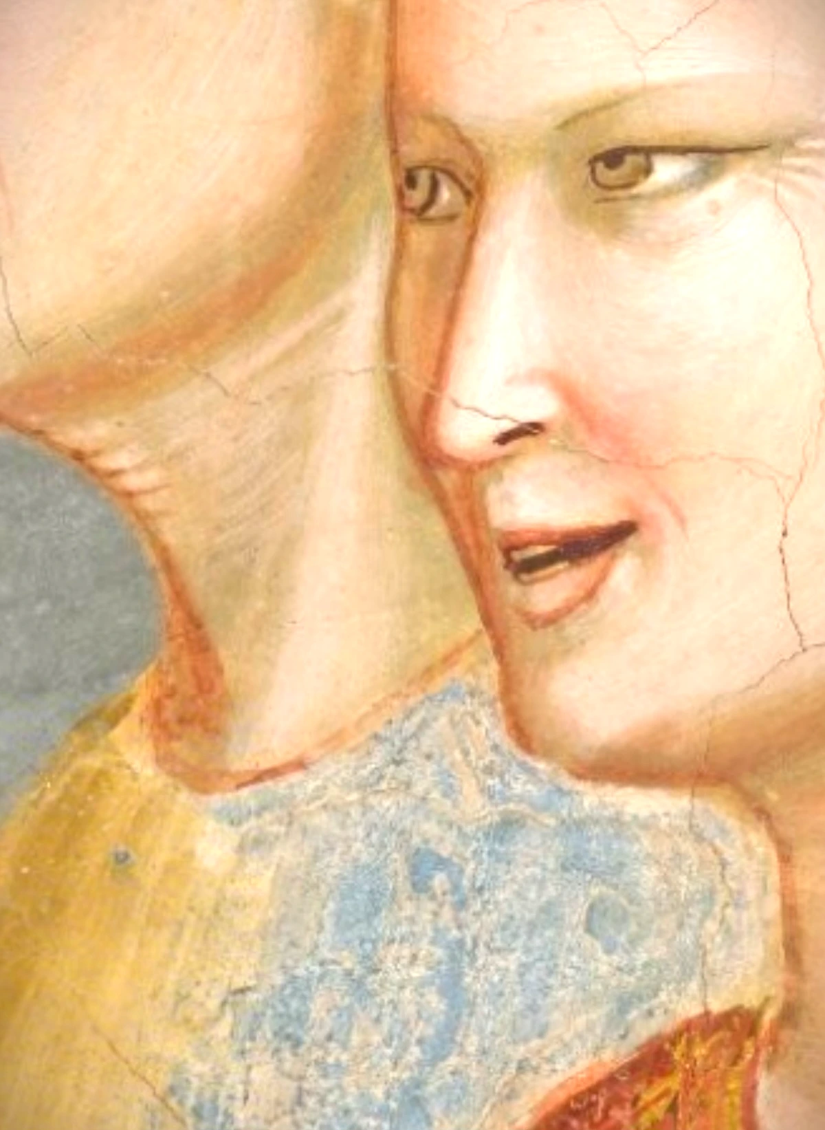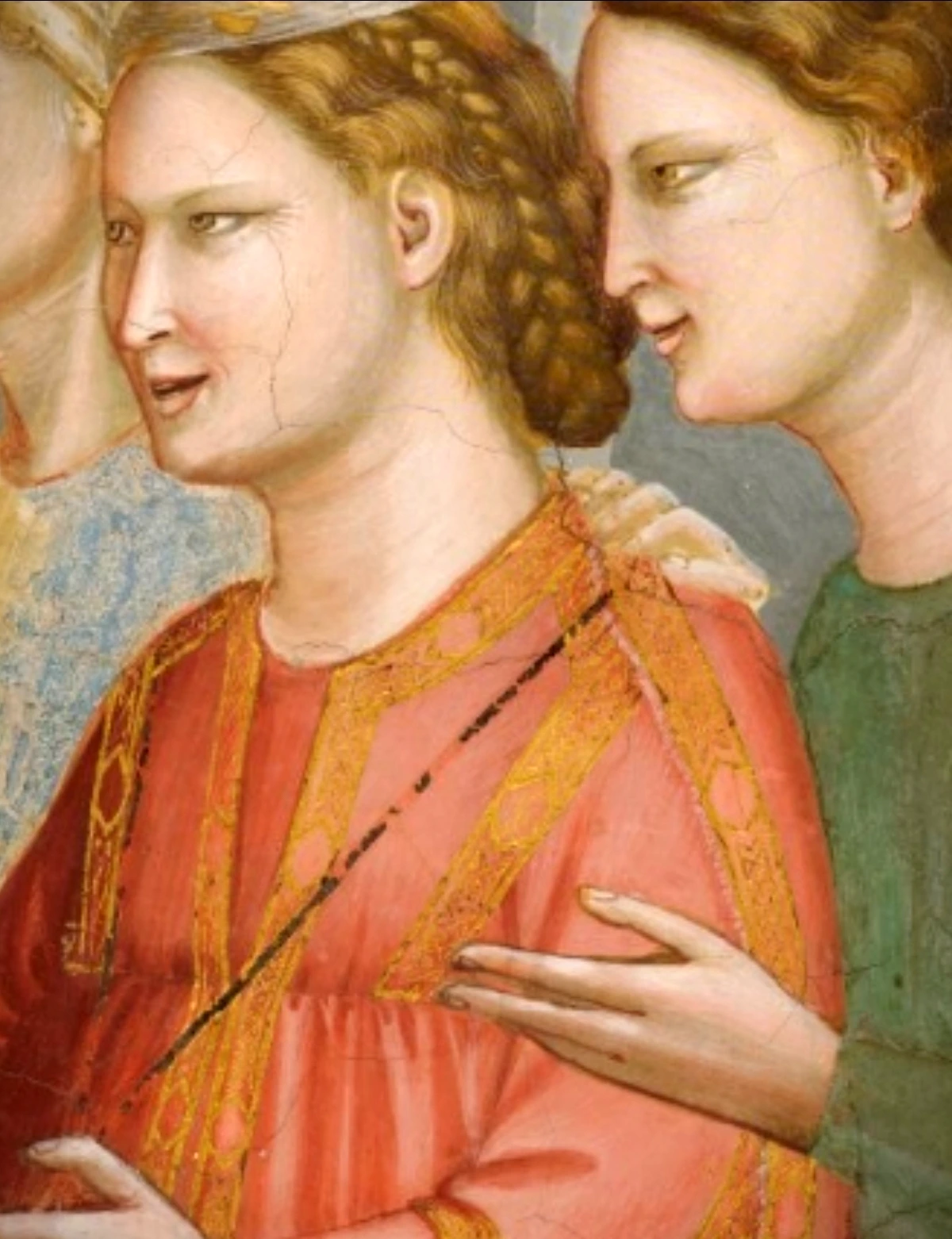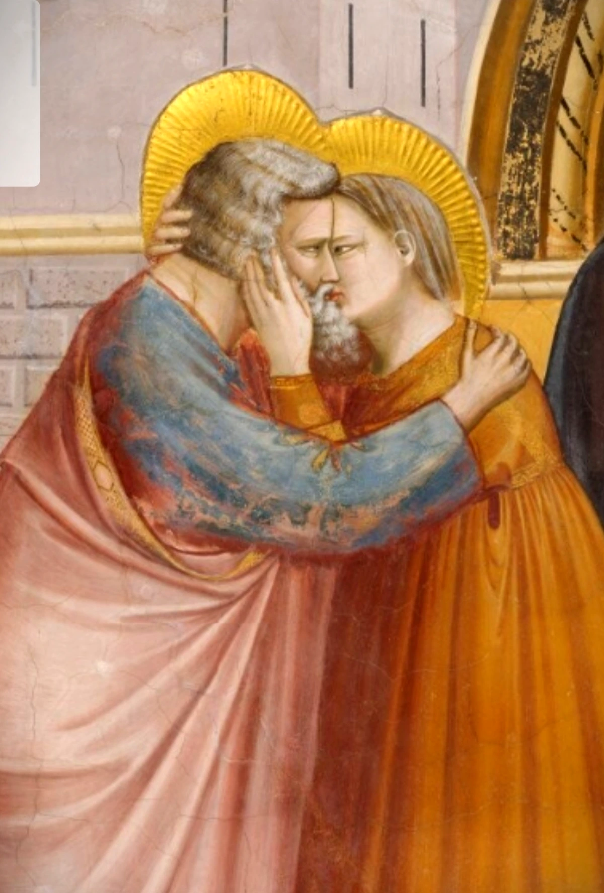 이 장면을 처음 본 중세의 사람들의 반응은 어땠을까? 지금은 별스럽지 않은 입맞춤이지만 당시에 공식적으로 남녀의 애정을 표현한 그림은 조토가 처음이지 않았을까? 그것도 경당을 꾸민 신성한 종교화에서 말이다. 얼굴과 어깨를 감싸고 눈동자를 들여다보며 나누는 입맞춤으로 서로에 대한 진심을 주고받는 이 그림은 하늘의 계시를 받은 요아킴이 광야 생활을 마치고 집으로 돌아오는 귀환을 그린 것으로 안나는 성문 밖까지 마중을 나왔다. 그토록 바라던 아이가 이제 곧 생길 것이라는 것을 요아킴도 안나도 알고 있는 상황이라 이들의 재회는 더욱 감격스러웠을 것이다.