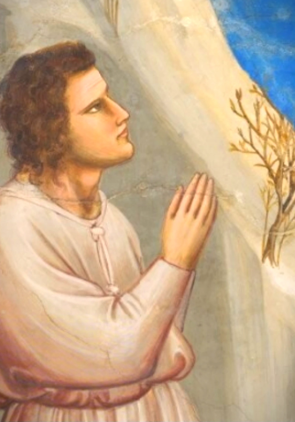 제단 앞에 엎디어 기도를 올리고 있는 요아킴의 눈빛과 표정, 그리고 꽉 움켜쥔 두 손이 그의 마음을 대변한다.