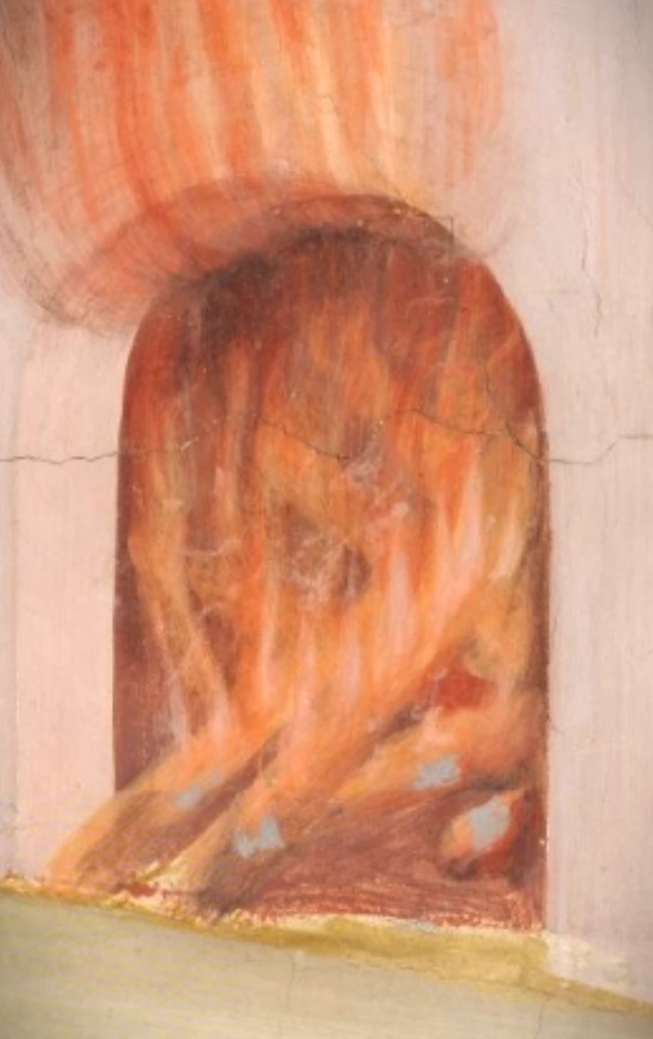 본래의 주제로 다시 돌아와서 번제를 바치는 제단을 보면, 얽혀서 쌓여있는 장작이 활활 타면서 불길이 솟구치고 있고 이미 다 타고 뼈가 드러난 제물이 연기가 되어 홀연히 하늘로 날아가는 모습을 사람의 영혼처럼 그린 것이 인상 깊다. 제물은 제 목숨을 잃은 까닭을 안다는 듯이 희생의 소임을 다하는 것처럼 곧 바수어질 고개를 애써 높이 들고 있다. 이러한 간구를 외면하지 않은 하늘은 손의 형상으로 나타나 이들에게 축복을 내리고 있다.