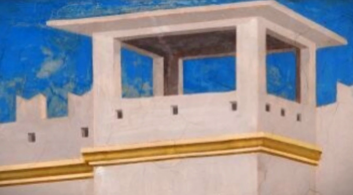 장면의 배경이 되는 성문은 도성을 지키는 요새로 그림에서는 자연 암반 위에 견고하게 쌓아 올린 형태다. 놓여있는 다리로 보아 성 주위에 해자를 둘러 방어막을 쳤고 문 양쪽으로는 망루를 높이 세웠으며 공격을 위한 작은 사각형 모양의 타구와 세로로 긴 현안도 보인다. 성문은 황금색으로 화려하게 장식되어 있어서 그림을 소개하는 여러 표현 중에 종종 '황금문'으로 부르기도 한다.
