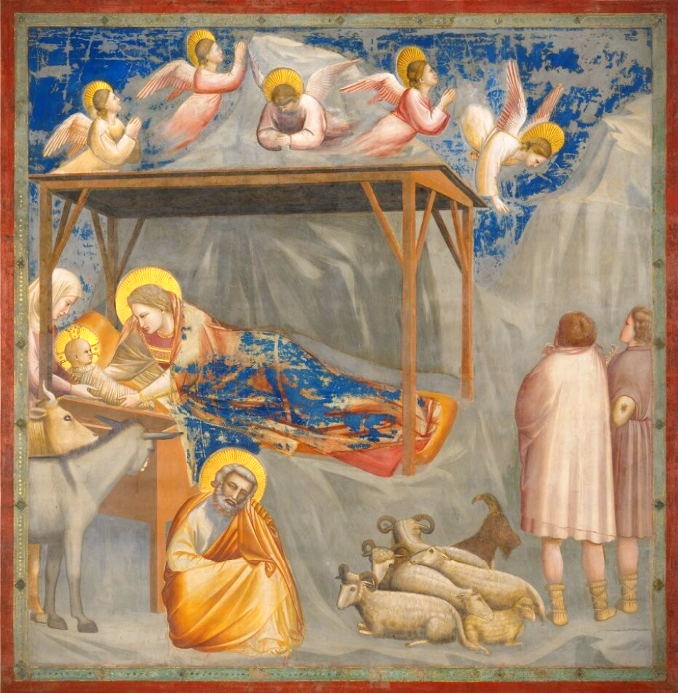 예수의 탄생에 관한 조토 그림의 이야기의 출처는 신약성경의 마태오 복음서와 루카 복음서인데, 예수의 탄생과 동방 박사들의 방문, 이집트로의 피신, 헤로데의 영아 학살은 마태오 복음서에 기록된 내용이고 성전에서 아기 예수를 봉헌하면서 시메온과 한나를 만나는 이야기는 루카 복음서에 기록된 내용이다.