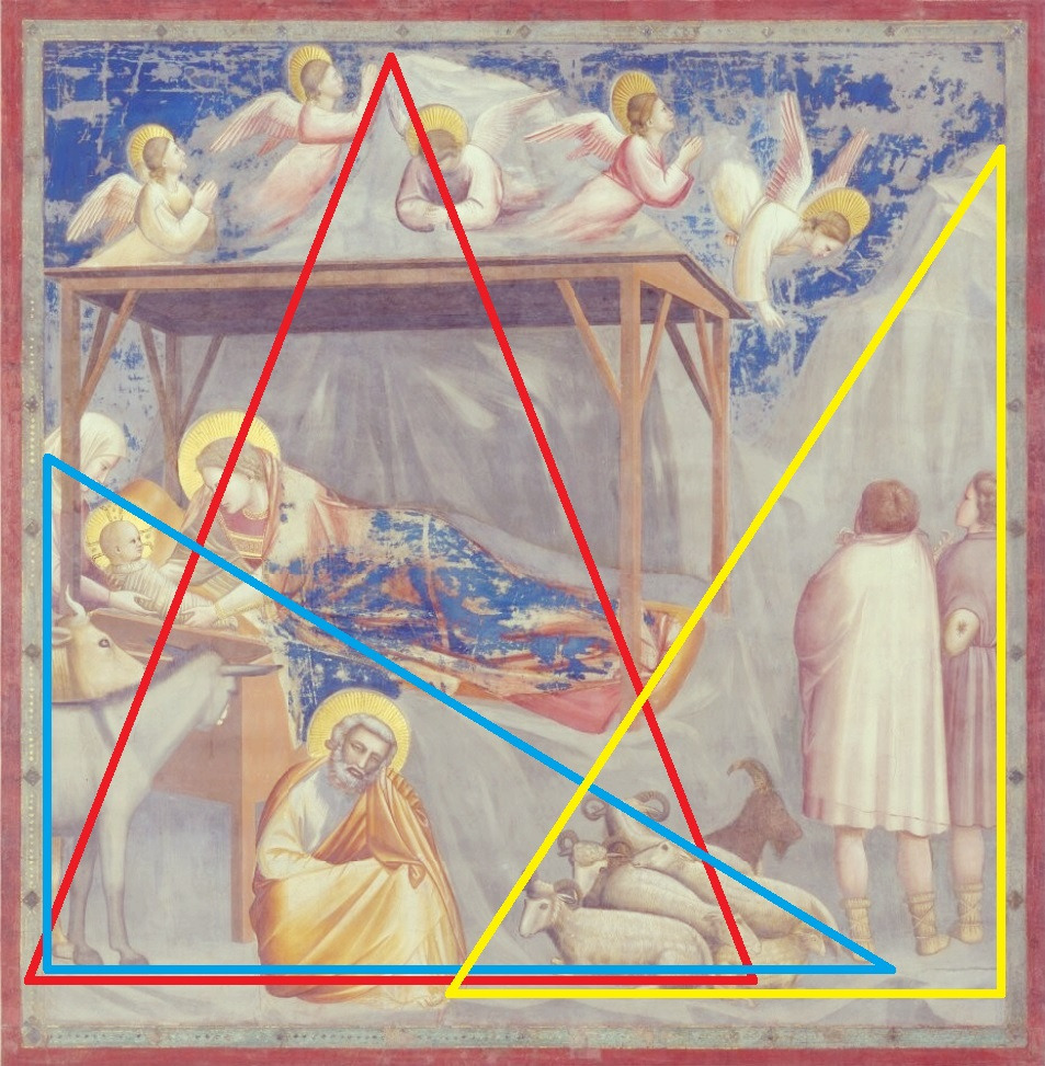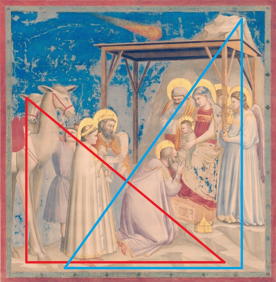 스크로베니 경당에 딱 들어서면 사방이 그림으로 가득 차있는 광경에 깜짝 놀라게 되는데, 공간을 빼곡히 메우고 있는 그림들을 마주하게 되면 대부분의 사람들은 혼란스럽기 마련이다. 하지만 조토는 관람자들이 혼란스러워하지 않도록 몇 가지 장치들을 그림 속에 넣어 두었는데 바로 안정적인 구도와 통일된 색감이다. 조토는 관람자들이 그림에서 편안함을 찾을 수 있도록 삼각 구도를 주로 사용하였다. 전체적인 큰 삼각 틀 안에 작은 삼각들을 배치하는 형태다. 이해를 돕기 위해 그림 위에 구도를 표시해 보았다.