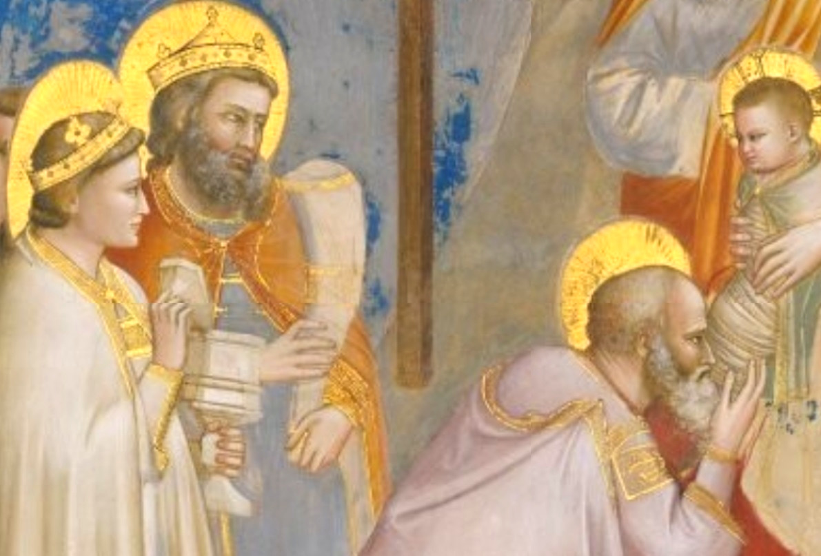 셋 중 연장자인 가스팔이 왕관을 벗어 땅에 내려놓고 무릎 꿇어 아기 예수를 가장 먼저 알현하고 있다.