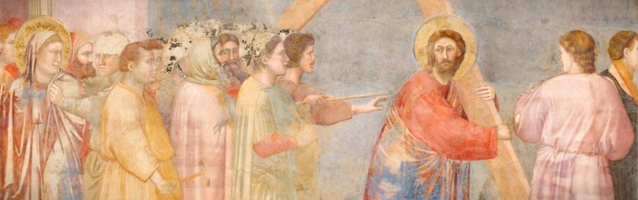 사형 선고가 내려진 후 군인들이 예수를 십자가에 못 박으러 끌고 나갔다. 예수가 십자가를 짊어지고 올라가 처형된 장소는 ‘해골터’라는 뜻의 ‘골고타’ 언덕이다. 당시 골고타는 예루살렘 성 밖에 위치해 있었다. 예수 사후 10년 즈음에 헤로데(영아 살해를 지시했던 헤로데의 후손인 헤로데 아그리파)의 명으로 새 성벽을 세우면서 골고타 지역이 지금처럼 도성 안으로 들어오게 된 것이다. 그림을 보면 예수와 무리들이 성문에서 나와 도성 밖으로 향하고 있다. 조토가 단순히 성경의 내용만을 그린 것이 아니라 역사와 지리 등 그림과 관련된 것들을 연구해서 그렸다는 것을 엿볼 수 있는 부분이다.