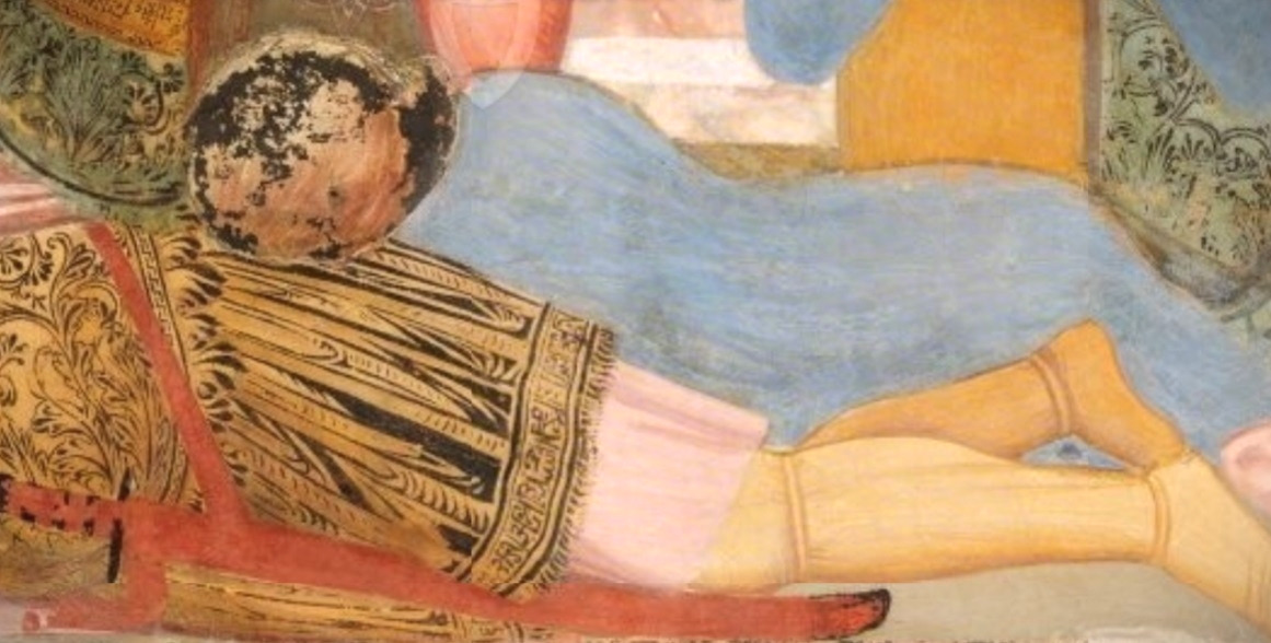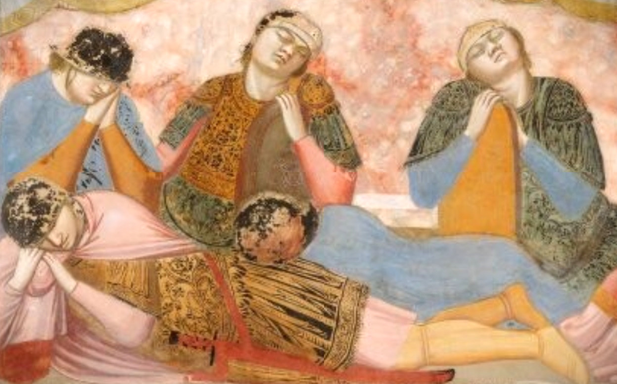 그 아래에는 밤을 지새우며 무덤을 지키던 경비병들이 피로를 이기지 못하고 곤히 자고 있다. 자신의 양손 혹은 방패를 의지 삼아 기대거나 동료의 골반을 베고 눕기도 했다.
