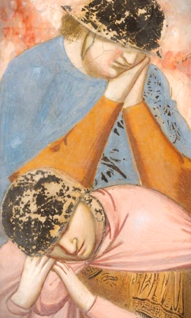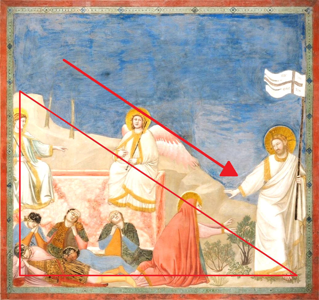 마리아에게 말을 건네는 예수의 표정을 보면 조토가 성경 말씀을 얼마나 깊이 이해하고 있는지를 알 수 있다. "나를 더 이상 붙들지 마라."라는 말은 자칫 단호한 어조로 읽히기 쉽지만, 이 말은 거절의 의미가 아니라 어서 가서 나의 부활을 다른 제자들에게 알리라는 당부이자 곧 다시 만날 것이니 안심하라는 따듯한 약속이다.