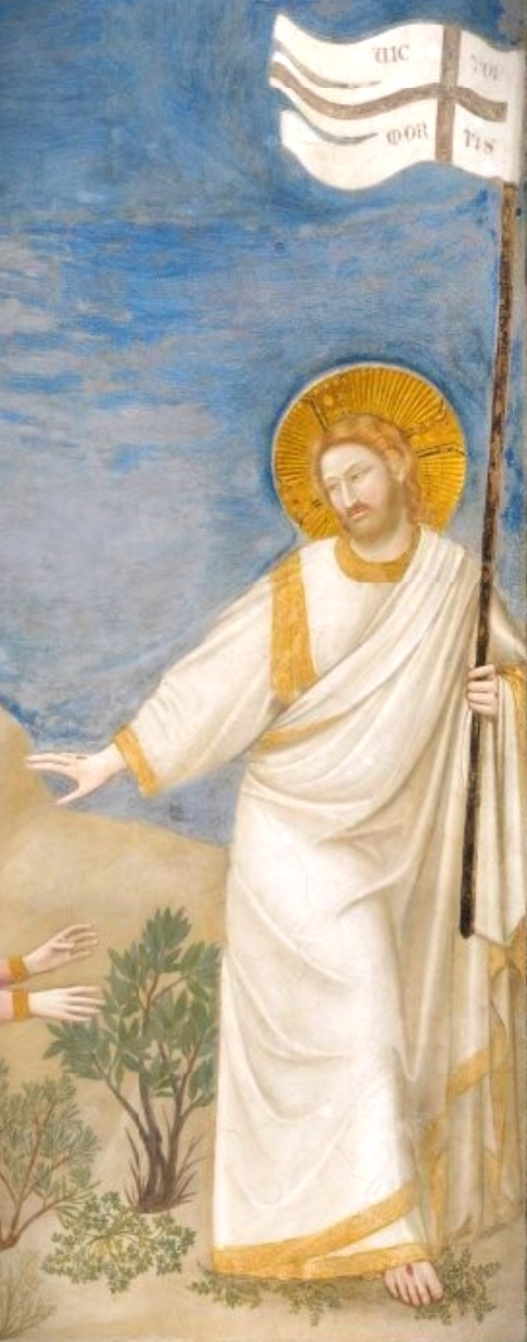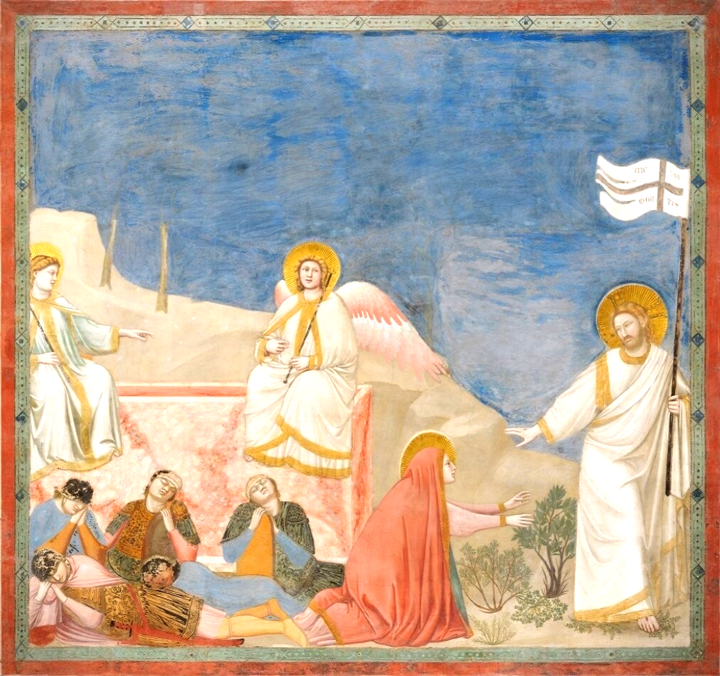 예수 그리스도의 부활은 4대 복음서 모두가 기록하고 있는데 조토는 그중에서 마태오 복음서와 요한 복음서의 이야기를 혼합해서 그림을 그렸다. 무덤을 지키는 경비병들은 마태오 복음서(27, 62-66)에 등장하는 이야기이며, 마리아 막달레나가 부활한 예수를 알아보고 "스승님!"하고 부르자, “내가 아직 아버지께 올라가지 않았으니 나를 더 이상 붙들지 마라."라고 대답한 일화는 요한 복음서(20, 11-18)에 나오는 이야기이다.