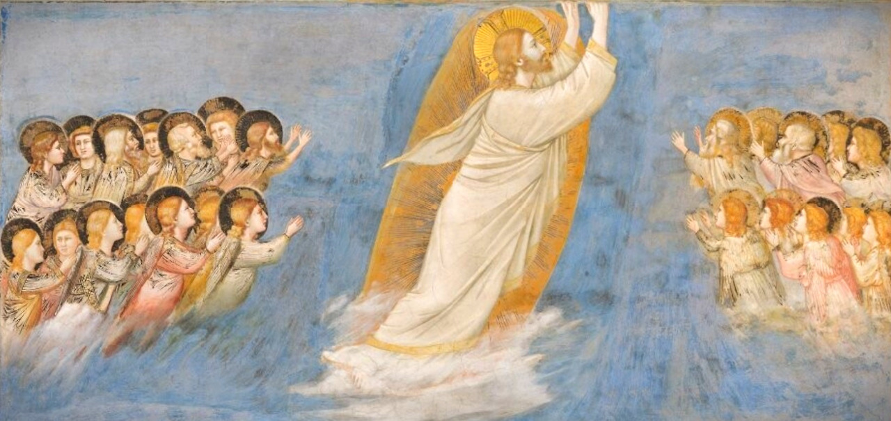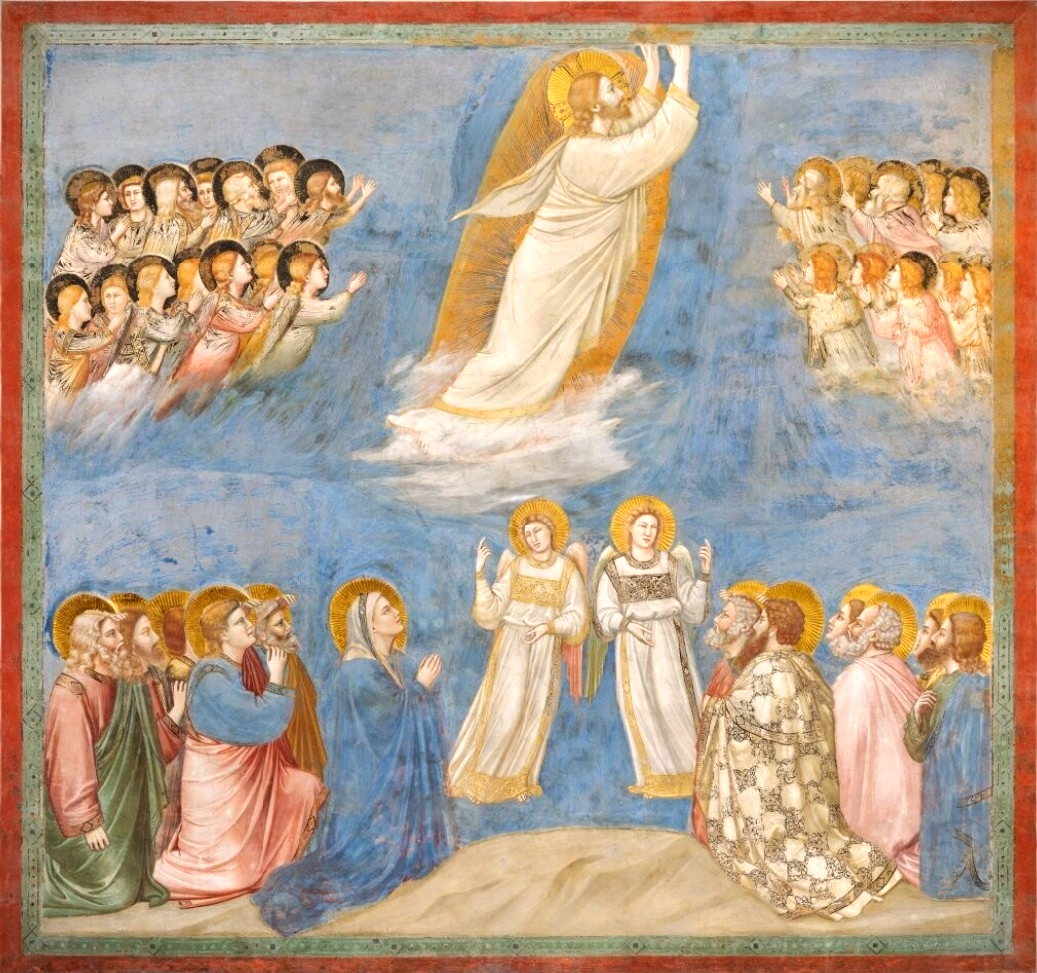 승천을 그린 이 그림은 '천상 세계와 지상 세계' 두 부분으로 나뉘어 있는데 천상 세계를 먼저 보면 빛에 둘러쌓여 구름을 타고 하늘로 올라가는 예수를 중심으로 하늘의 성인들과 천사들이 좌우로 도열해 있다. 날개를 달고 아랫줄에 있는 이들이 천사들이고 날개 없이 망토를 두르고 있는 윗줄이 성인들이다. 특이한 점은 예수의 손이 프레임 밖으로 나가 보이지 않는 것인데, 이것은 인간의 몸을 지닌 예수가 지상의 영역에서 벗어나 천상의 영역에 들었음을 의미한다.