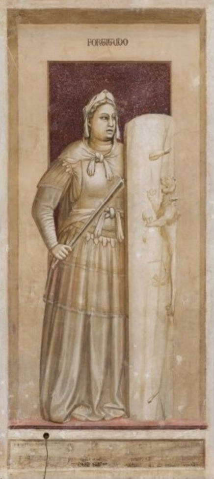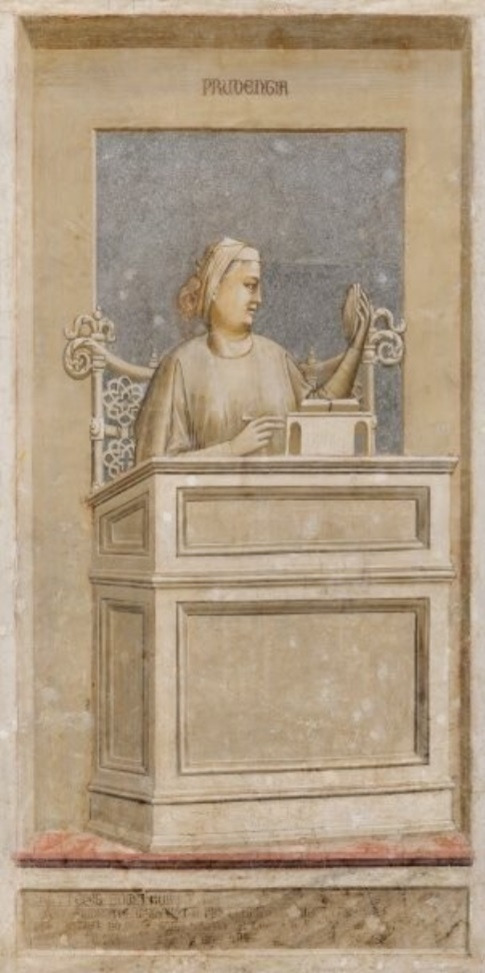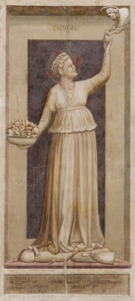 교의(敎義)의 목적을 가지고 교훈적인 덕목들을 의인화(擬人化)한 도상(圖像) 작품들이 11세기 무렵부터 건물을 장식하는 데에 널리 사용되었다. 스크로베니 경당의 좌우 벽면 하단에도 '미덕과 악덕'의 도상이 그려졌다.