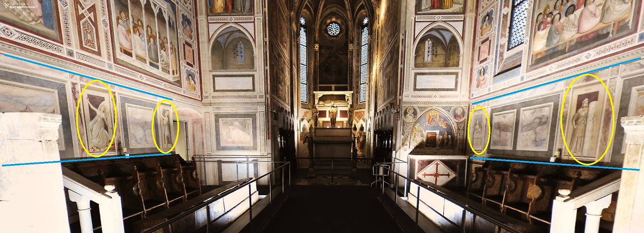알아보기 쉽도록 파란 선에 노란 동그라미로 도상들의 위치를 표시해 보았다. 제대를 중심으로 오른쪽에 나열된 것이 미덕의 도상이고 왼쪽이 악덕에 관한 내용이다. 각각의 미덕과 대비되는 악덕들이 서로 마주하고 바라보는 배치이다.
