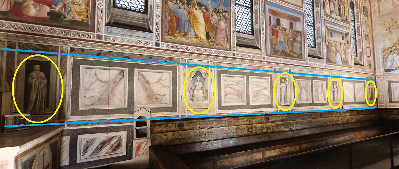 경당에 들어서면 정면(동쪽) 제대를 중심으로 좌우의 북쪽과 남쪽 벽면을 이루는 4단의 그림들이 빼곡하게 들어차 있는데, 도상들은 가장 아랫단에 그려져서 그림 전체를 떠받치는 주추 역할을 한다. 특이한 점은 위층에 그려진 화려한 채색의 성경 장면들과는 다르게 이 그림들은 무채색으로 그려졌다는 것이다. 가르침과 훈계의 내용을 무게감 있게 전달하려는 조토의 의도이다.