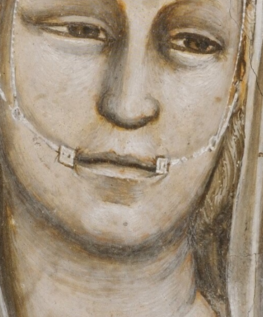 재갈은 말을 하지 못하도록 입에 물리는 물건으로 불만이나 고통을 입 밖으로 소리 내어 표현하지 않겠다는 의지를 드러낸다. 칼은 사용하려고 손에 든 것이 아니라 오히려 칼집에서 빼지 못하도록 단단한 가죽 벨트로 붙들어 맨다. 분노의 칼날을 함부로 휘두르지 않는 인내는 결국 참고 견뎌야 하는 내적 고통을 수반하기에 여인의 눈이 슬프다.