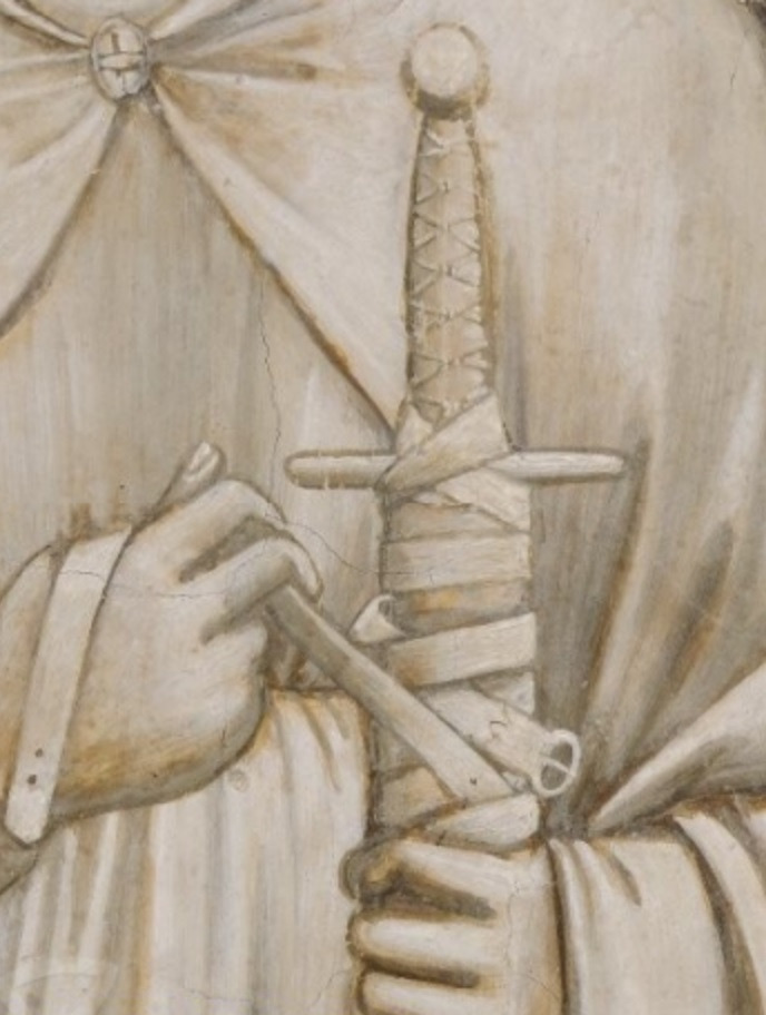 단순히 칼을 들고 있는 사람처럼 보이지만 자세히 들여다보면 입에 재갈을 물고서 칼을 동여매고 있다.