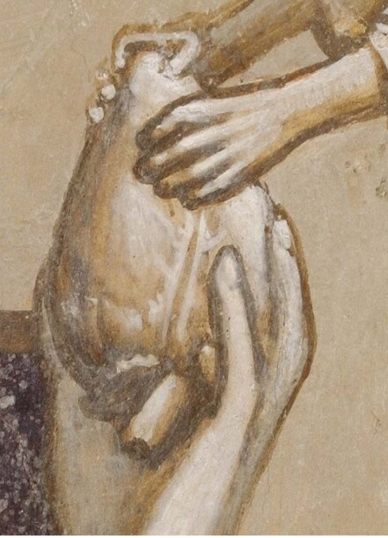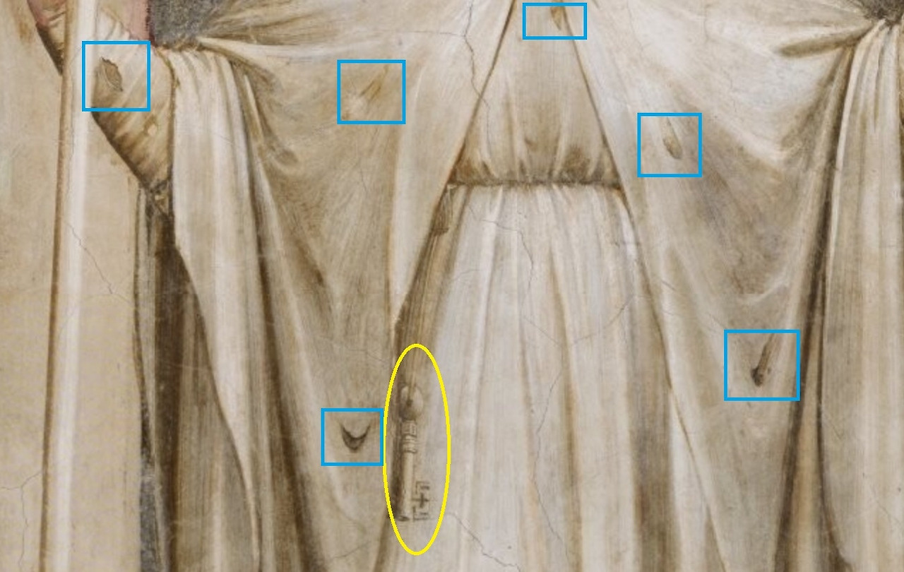 허리끈에는 열쇠가 달렸는데(노란 동그라미 표시), 당시의 열쇠는 크기가 매우 커서 청지기들은 맡은 열쇠를 허리에 매달거나 어깨에 메고 다녔다. 청지기는 주인의 재산을 관리하기에 믿을 수 있는 이에게만 그 일이 주어졌다. 열쇠가 곧 믿음의 상징인 것이다. 그런데 입고 있는 옷이 군데군데 찢어지고(파란 네모 표시) 해졌다. 믿음을 지키는 것이 결코 쉬운 것이 아니라는 것을 암시한다.