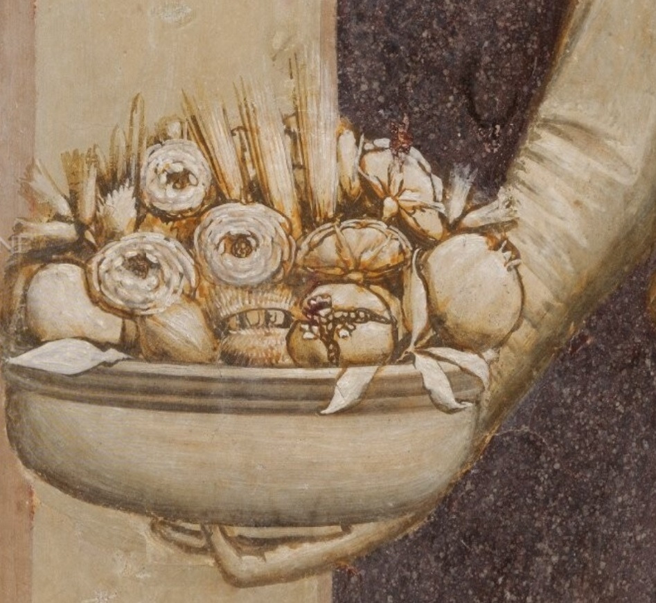 여인이 들고 있는 바구니에는 온갖 열매와 곡식, 아름다운 꽃이 가득한데 하늘로부터 받은 풍요로운 사랑을 의미한다. 손에 직접 전달되는 것은 꽃봉오리 모양의 심장으로 자세히 보면 동맥이 보인다.