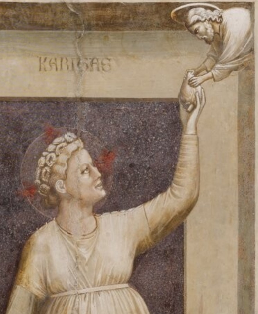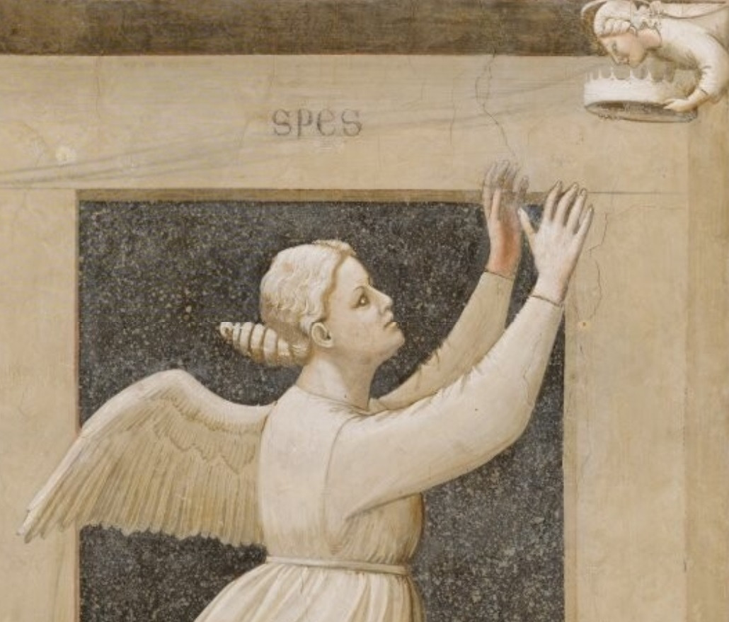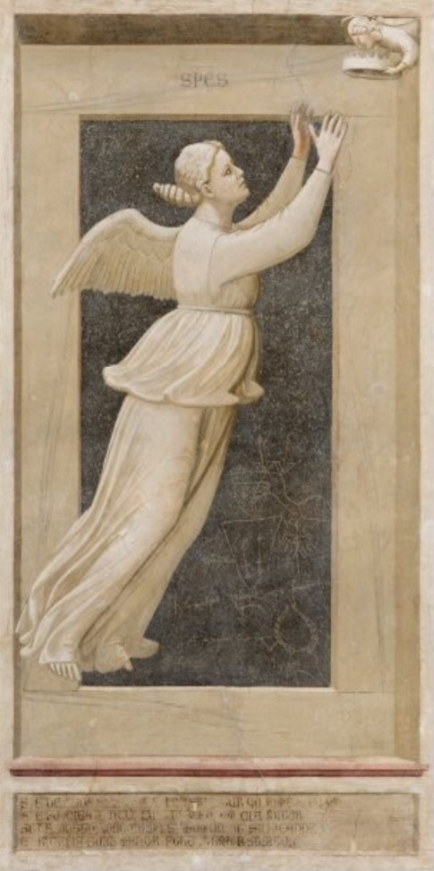 하늘로부터 하사되는 영광스러운 왕관을 받기 위해 날개를 달고 하늘로 오르는 모습을 조토는 희망으로 나타냈다. 왕은 인간세상에서 가장 높은 지위로 사람이 앉을 수 있는 최고의 자리인 것처럼 구원을 통한 영원한 생명, 곧 천상복락이 믿는 이들의 최종 단계라는 것을 말한다. 솟아오르는 역동성을 표현하기 위함인지 아니면 하늘 위 중력이 없는 공간을 나타냈는지 모르겠지만 묶은 머리가 중력을 거슬러 다른 방향으로 뻗친 모습이 흥미롭다.