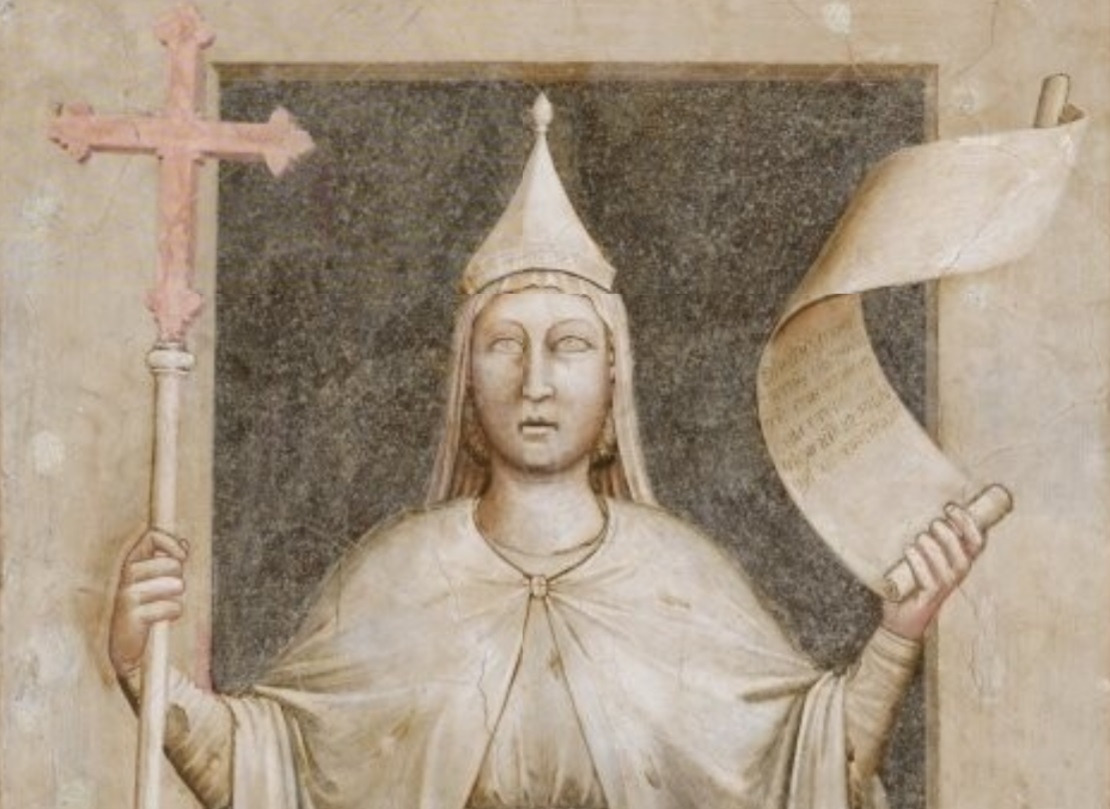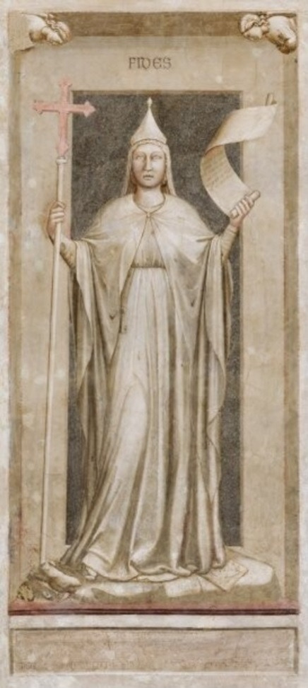 여인이 신앙의 대상이 되는 말씀과 교리를 상징하는 두루마리와 신앙의 목적이 되는 구원을 상징하는 십자가를 들고 있다.