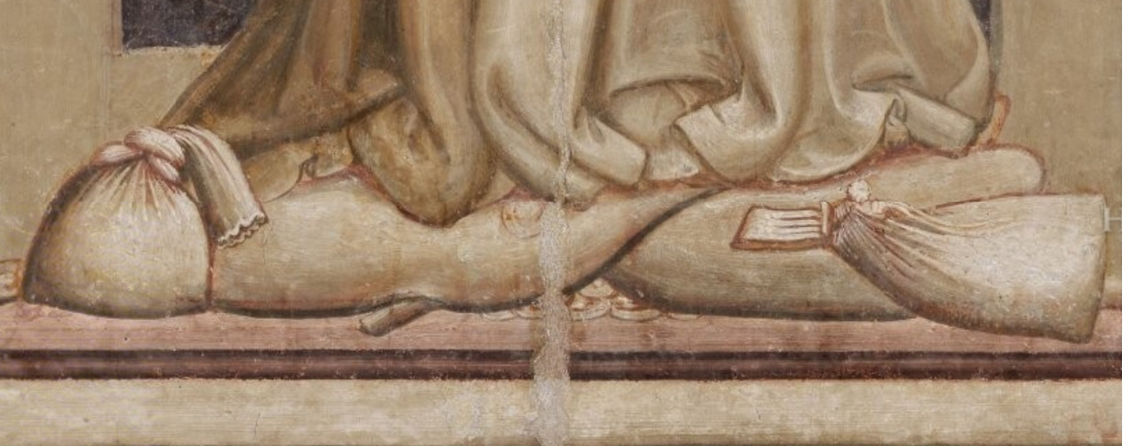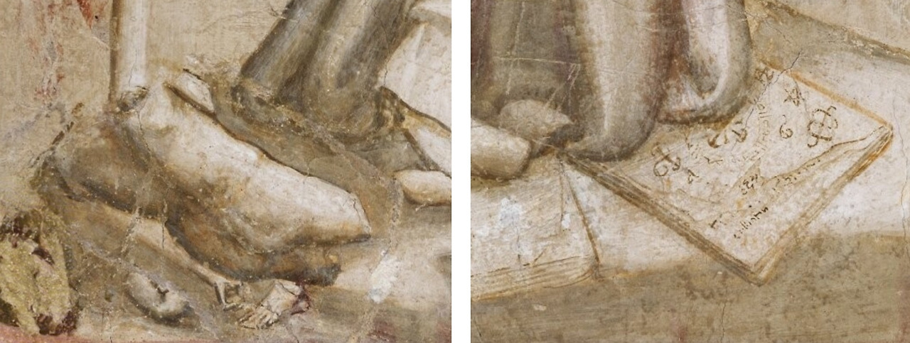 아래에는 나동그라진 조각상과 책이 있는데 이는 이교도들이 숭배하는 것이다. 신앙이란 '믿는 마음'만이 아니라 '따르는 행위'를 포함하는 것으로 우상을 깨뜨리고 점술책을 짓밟는 적극적인 행동으로 신앙을 증거하고 있는 것이다.