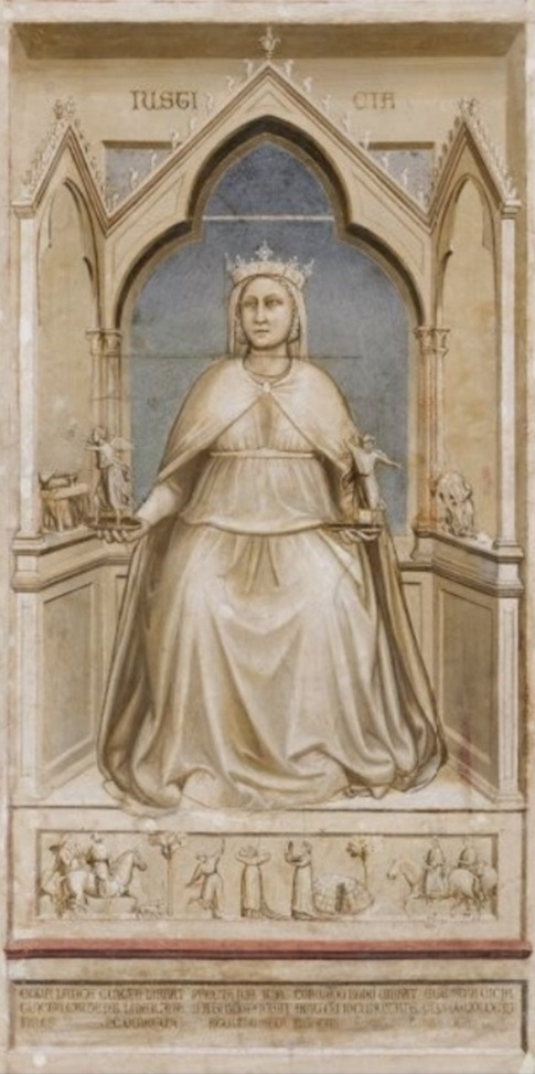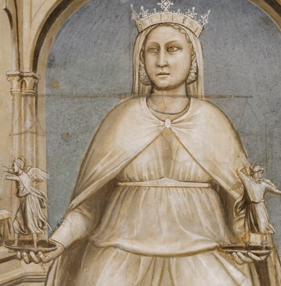왕관을 쓴 여인이 양손에 둥근 접시 모양의 저울판을 들고 앉아 선악을 판별하고 있다. 공정과 공평을 위하여 두 눈은 판결받는 이를 향하지 않는다.