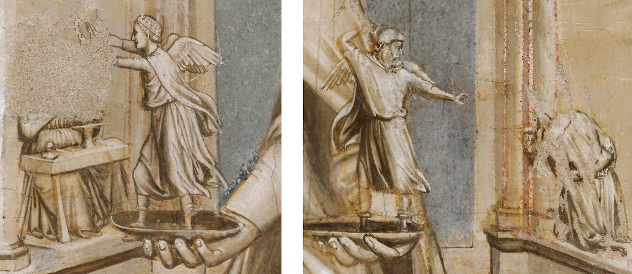 저울판 위에 올라가 있는 이는 천사이다. 공정한 판결은 이미 내려졌고, 천사가 선고에 따른 집행을 하는 것이다. 선행을 한 이에게는 월계관이 씌워지고 있고, 악행을 저지른 이에게는 벌이 내려지고 있는데 자세히 들여다보면 의자에 앉아 상을 받는 선인과 땅바닥에 무릎이 꿇린 채 결박당해 있는 악인의 상반신이 심하게 훼손되어 그 얼굴이 보이지 않는다. 세월에 따른 자연스러운 손상이 아니라 누군가에 의해 의도적으로 얼굴이 지워진 것으로 보인다.