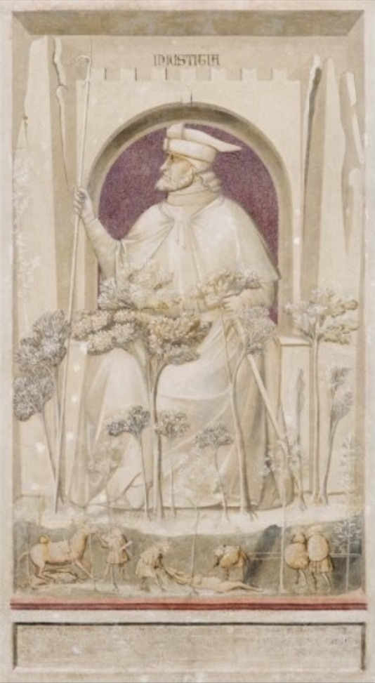 불의는 공정과 공평을 말하는 정의와 구별되는 개념이다. 거대하고 견고한 성의 군주가 무시무시한 갈고리가 달린 창과 큰 칼을 쥐고 앉아 있다. 성주의 권력이 얼마나 큰지 쳐든 고개가 거만하기 그지없다.
