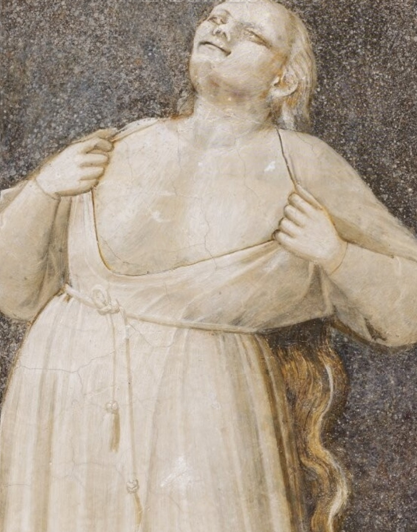여인이 분하고 화가 난 마음을 어찌할 줄 몰라 머리를 풀어헤치고 옷을 찢고 있다. 절제와 대비되는 분노는 모든 죄악의 시발점이다. 자칫 욕설, 비하, 폭력과 복수로 쉽게 변질되기 때문이다. 분노의 에너지를 정의 회복의 원동력으로 삼는 지혜가 필요하다.