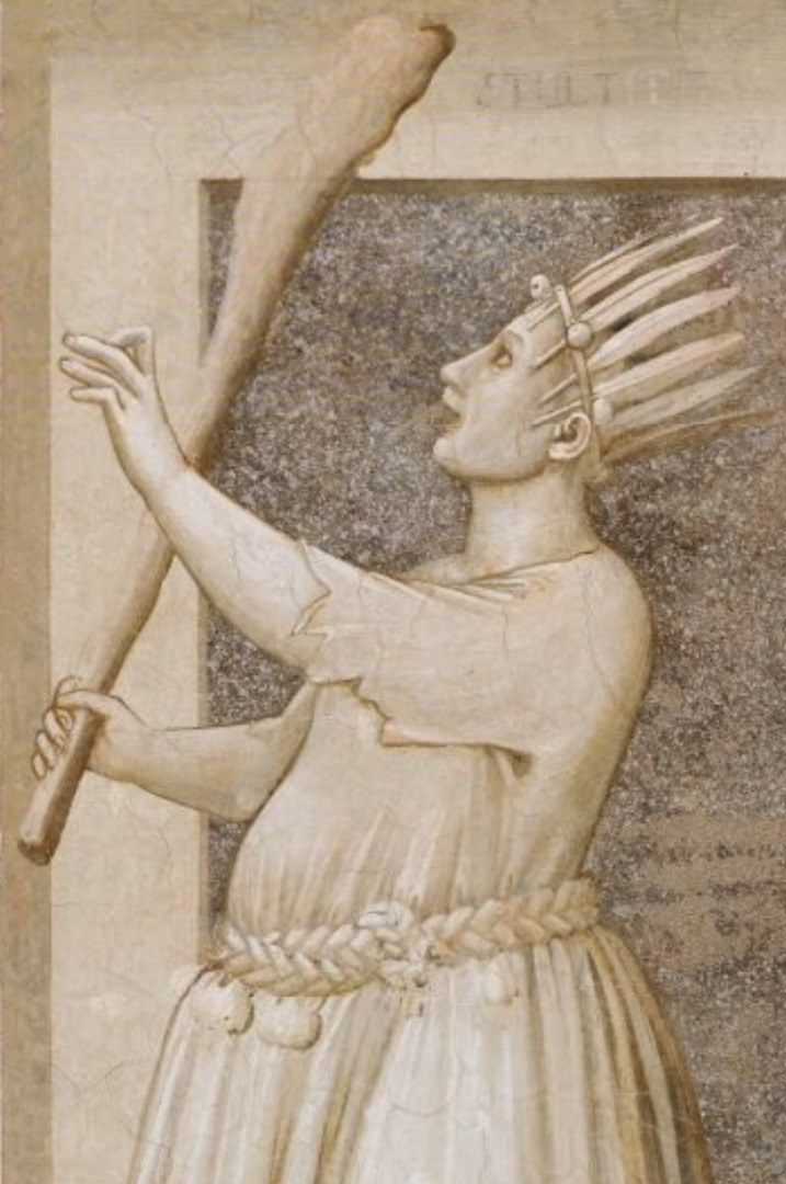 신중함과 마주하는 어리석음은 사리 분별을 못하는 한 남자로 그려졌다. 뒷자락이 긴 예복을 스스로 만들어 입고 머리에는 왕관도 썼다. 권위를 상징하는 왕홀(王笏, scepter )을 들고, 귀한 것들을 주렁주렁 매단 커다란 허리띠를 둘렀지만 남들이 보기에 이 모든 것은 누더기와 잡동사니일 뿐이다. 맨발에 몽둥이를 든 그는 어딘가 조잡하고 꽤나 우스꽝스러워 존엄이나 품위를 찾아보기 어렵다.