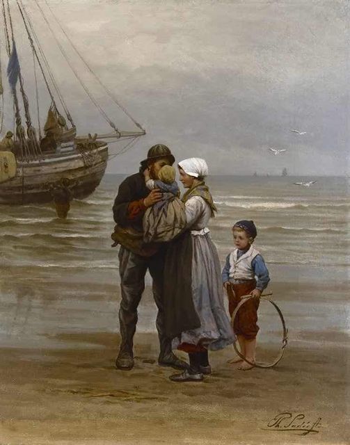저 가장은 부인에게 어린 자녀들을 맡기고 뒤로 보이는 배에 올라 곧 떠날 것이다. 배의 규모로 보아 먼바다까지 나가는 고깃배 같다. 예상대로라면 이 가족의 이별은 긴 시간이 될 것이다. 이들이 다시 만날 날은 언제가 될까? 다시 돌아올 수는 있을까? 거친 파도는 뱃사람의 귀환을 보장하지 않는다. 구름이 잔뜩 낀 잿빛 하늘과 바다의 일렁임에 불안감이 앞선다.