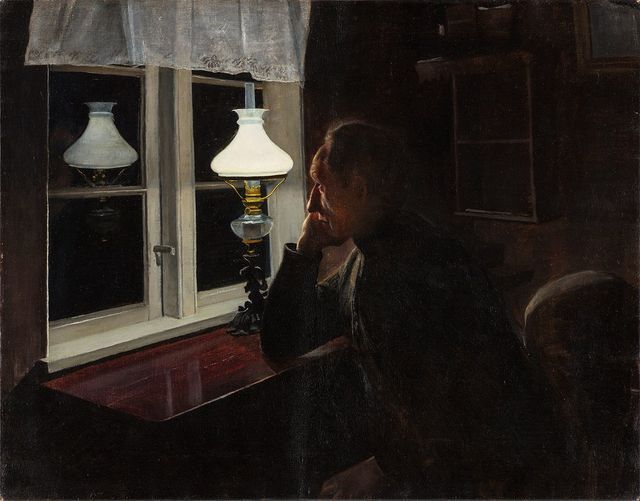 L. A. Ring_Alone. Interior by Lamplight with a Seated Man Buried in Thought (1899)
