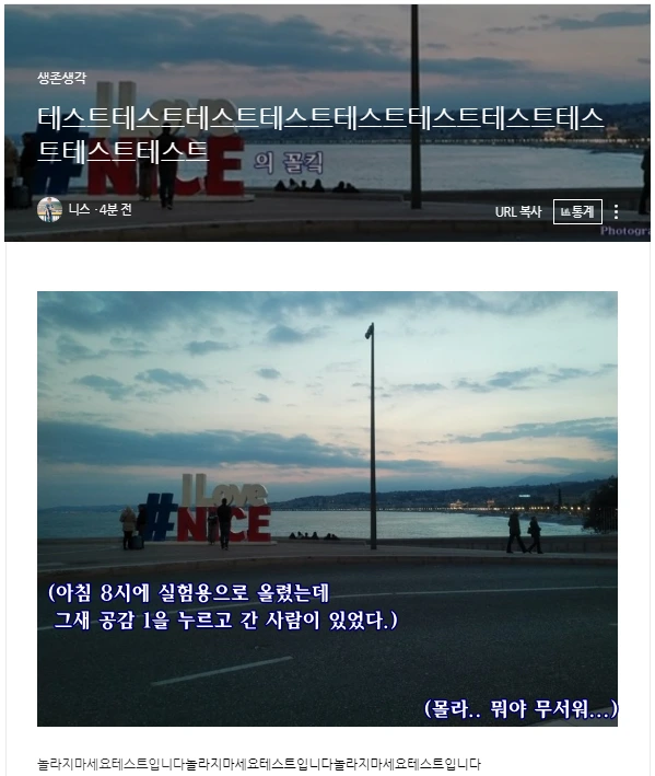 그래서 준비했다. 각 공유 매체별로 그리고 PC나 모바일별로 썸네일 아래 제목과 리드의 각 글자 수를 비교하며 최적의 길이를 찾아보는 것이다. 이를 위해 하나의 실험을 실시했으니 그 경과를 알려주마. 맨 먼저 테스트용 포스팅을 하나 작성했다. 제목은 ‘테스트테스트테스트테스트…’ 본문은 ‘놀라지마세요테스트입니다…’다.